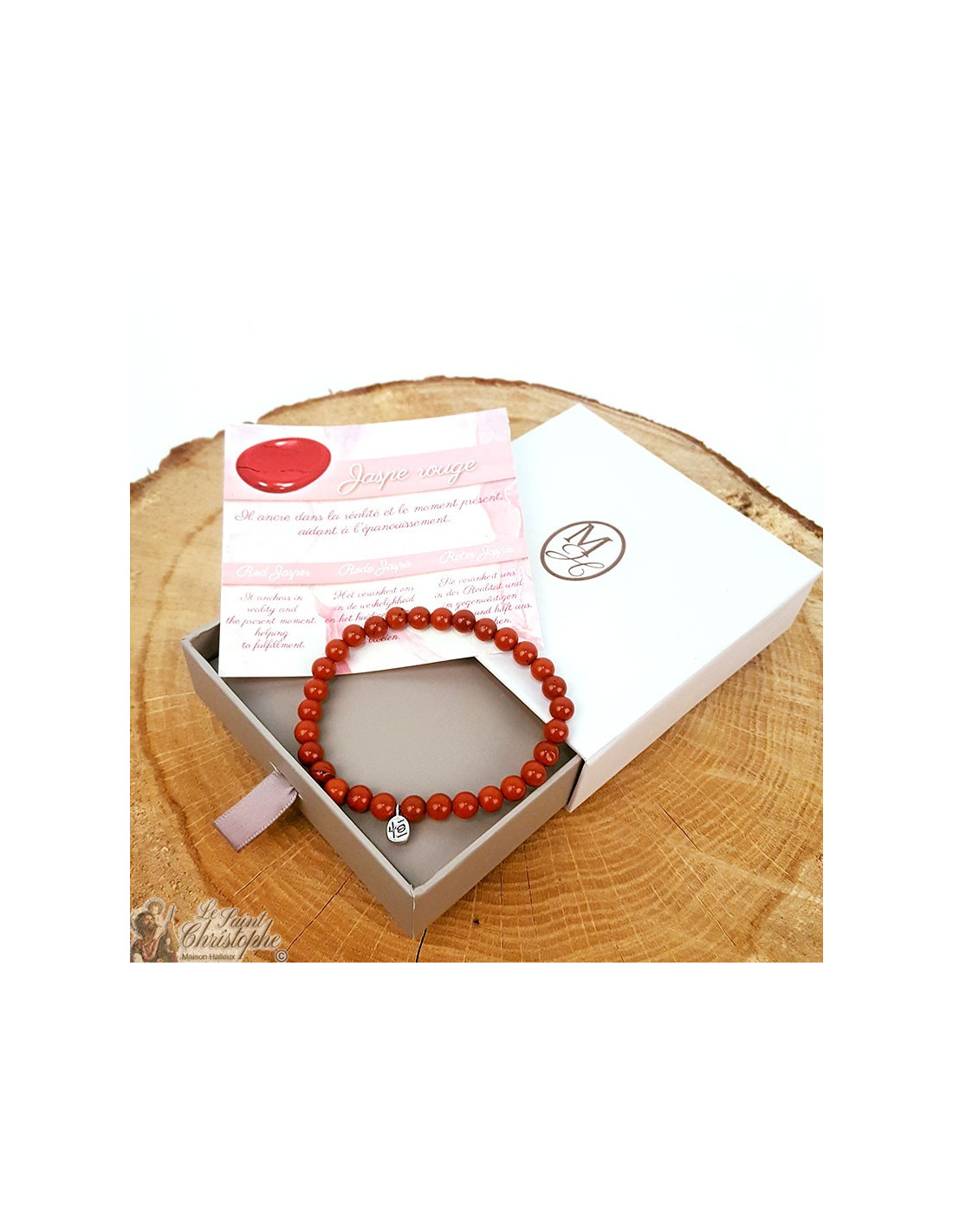 Aux teintes rouge brique avec parfois quelques veines plus claires ou foncées, le jaspe rouge est une pierre qui symbolise la force et la stabilité. Elle ancre son porteur dans la réalité et l'aide à aimer la vie, à avoir confiance en cette dernière, à vivre le moment présent. On la conseillera donc pour les personnes qui ont tendance à trop se projeter dans le passé ou dans le futur, qui ont tendance à avoir peur de la mort ou de l'inconnu ou qui sont déprimés. Elle les rassurera et les encouragera à s'affirmer par l'action, à s'épanouir. Sur le plan physique, le jaspe rouge, très vitalisant, aide à la circulation sanguine ou réduit l'effet de jambes lourdes. Elle dynamise autant l'esprit que le corps. Outre ces spécialités, le jaspe protège aussi son porteur des énergies négatives.