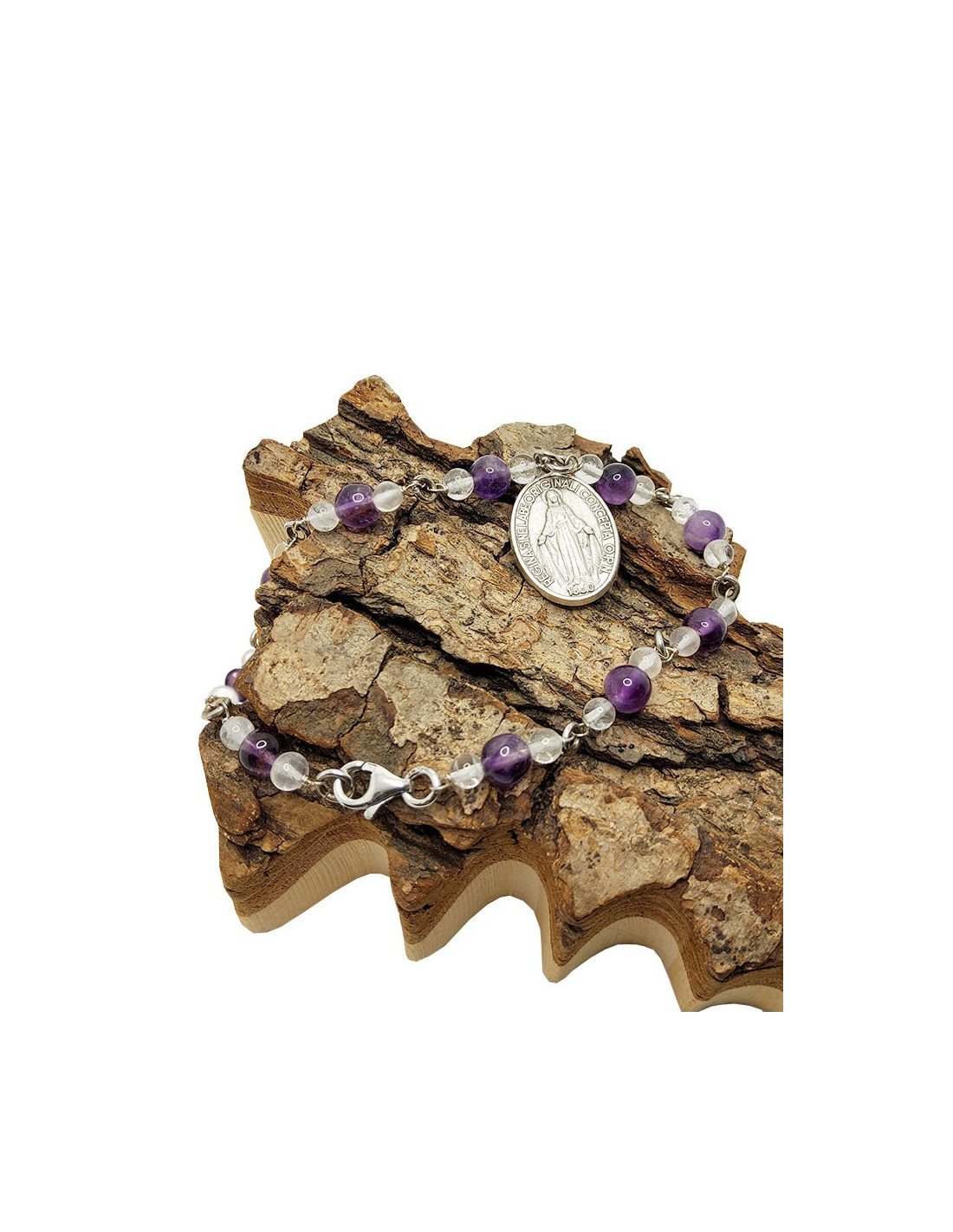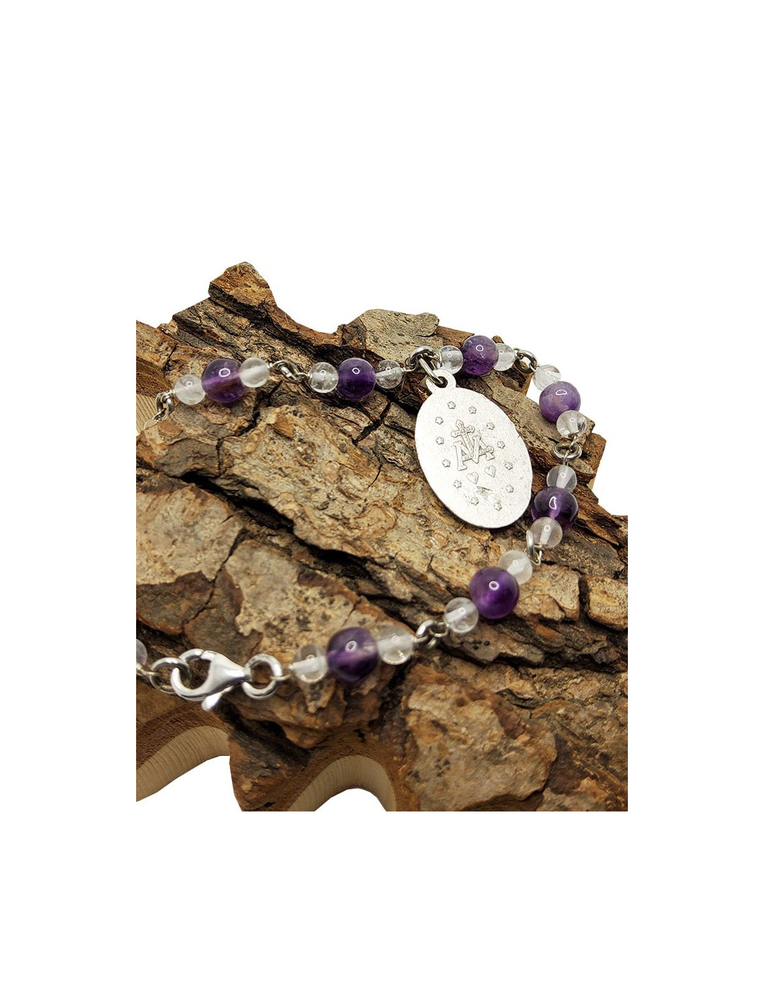 Bracelet en argent 925 avec Médaille de la Vierge Miraculeuse, perles en améthyste et cristal de roche. Les deux pierres, en perles bien rondes, sont placées en alternance pour un joli motif de couleurs.
