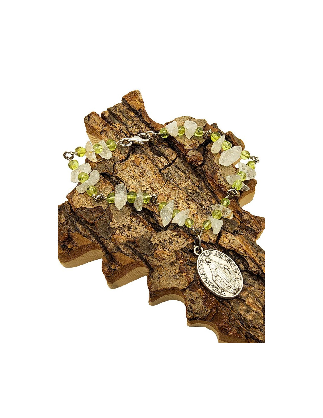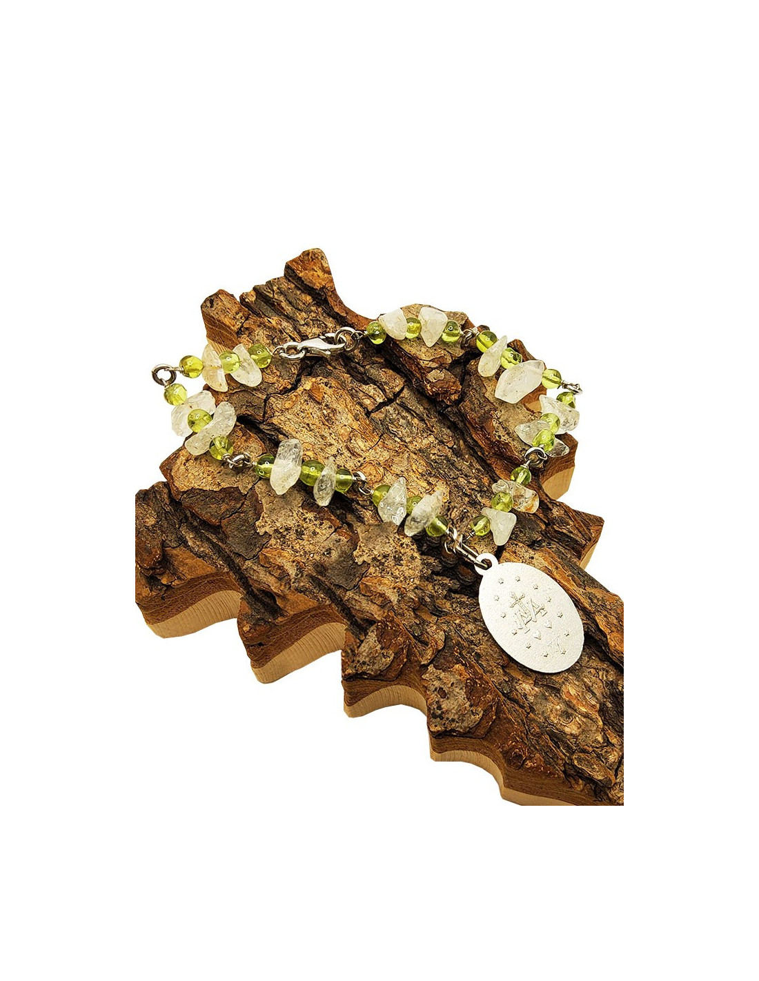 Bracelet en argent 925 avec Médaille de la Vierge Miraculeuse, perles en aventurine et cristal de roche. Les deux pierres sont placées en alternance pour un joli motif de couleurs et de formes.