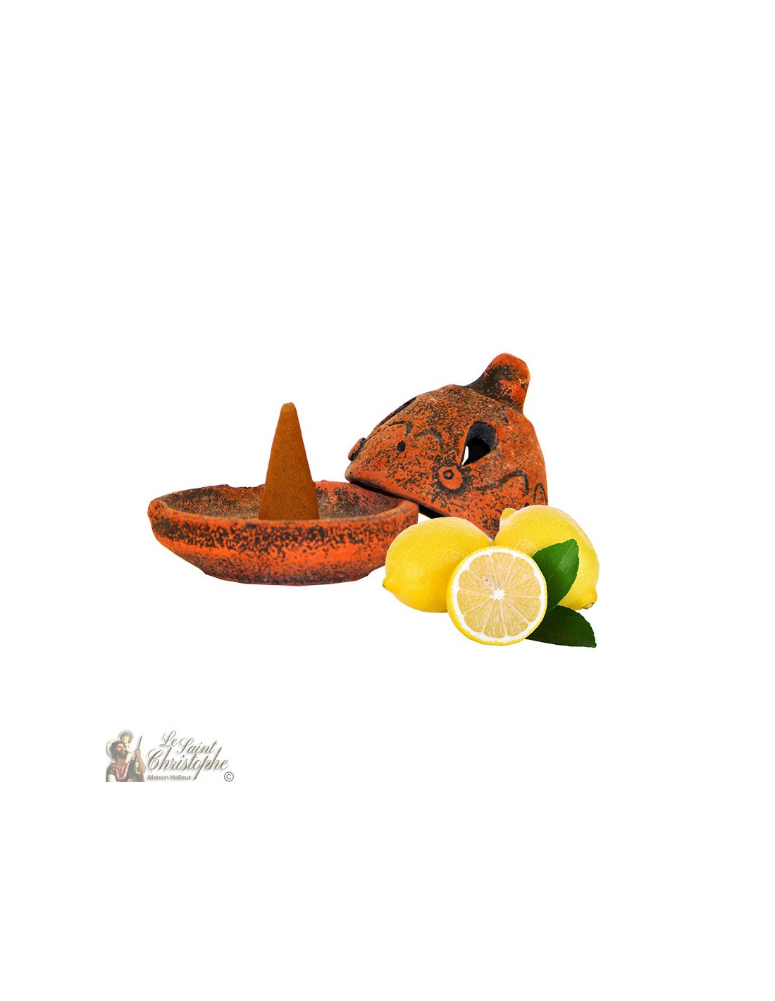 Ce support pour cône d'encens a été réalisé à la main, en terre cuite, par des artisans. Il est accompagné de dix cônes d'encens au parfum de citron. Vous trouverez aussi dans la boîte du petit bois de décoration, qu'il est possible de brûler avec l'encens.