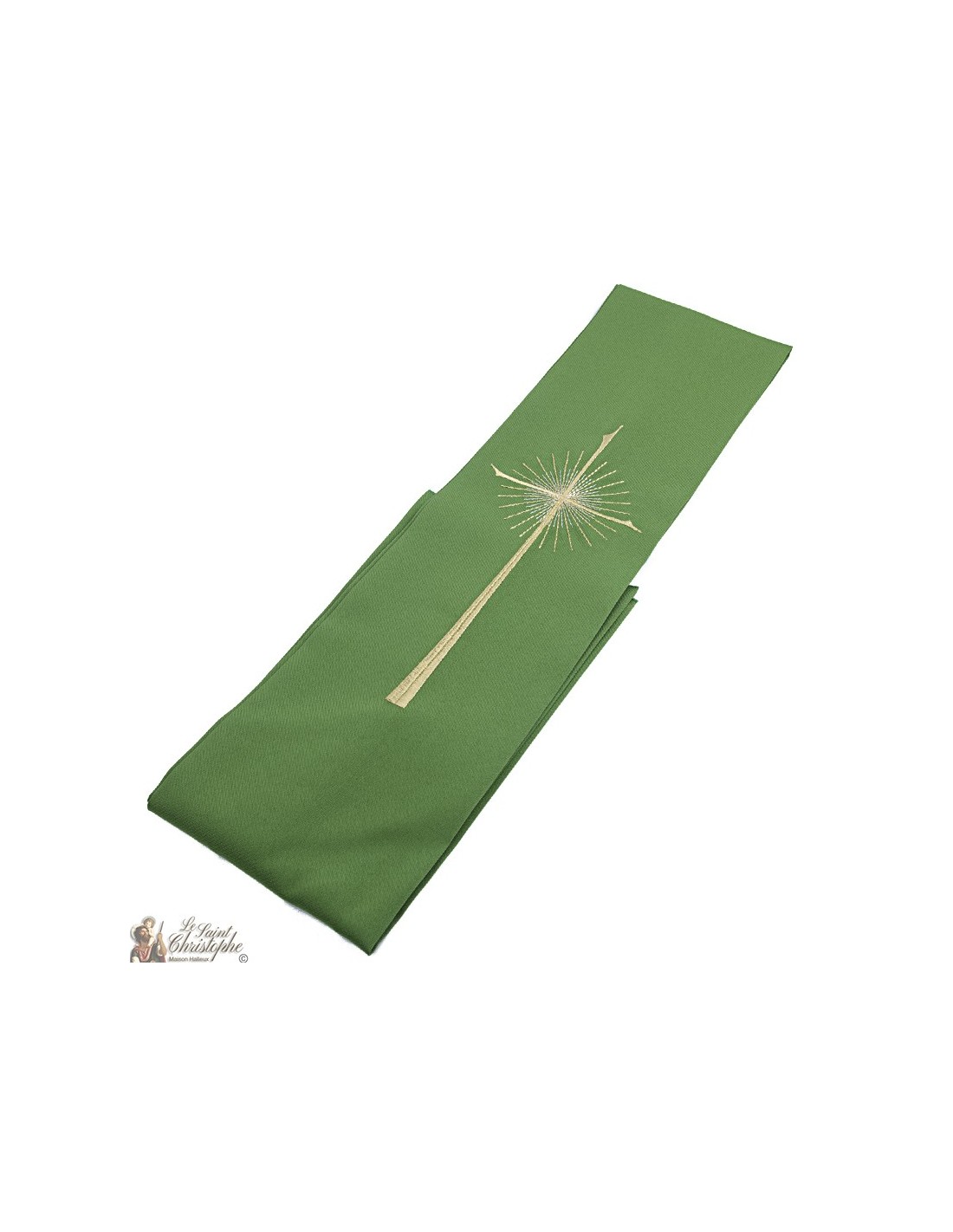 Étole pour prêtre verte et brodée. Entièrement réalisée à la main, l'étole est facile à entretenir et lavable en machine. La broderie en fils dorés et blancs, représentant une croix moderne et fine, très élégante, auréolée de rayons lumineux.