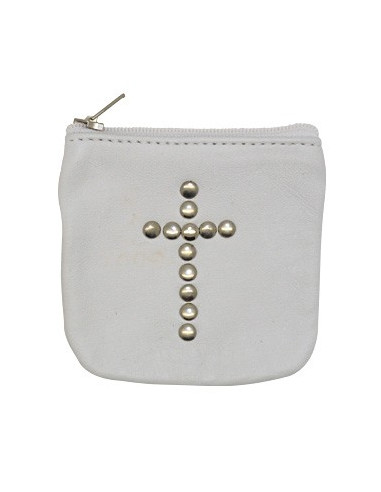 Etui en cuir avec décoration en clous métalliques ronds formant une croix. Cette petite pochette peut contenir un dizainier ou un chapelet, servir de porte-monnaie, ou contenir d'autres objets qui vous tiennent à coeur. L'étui est entièrement réalisé à la main.