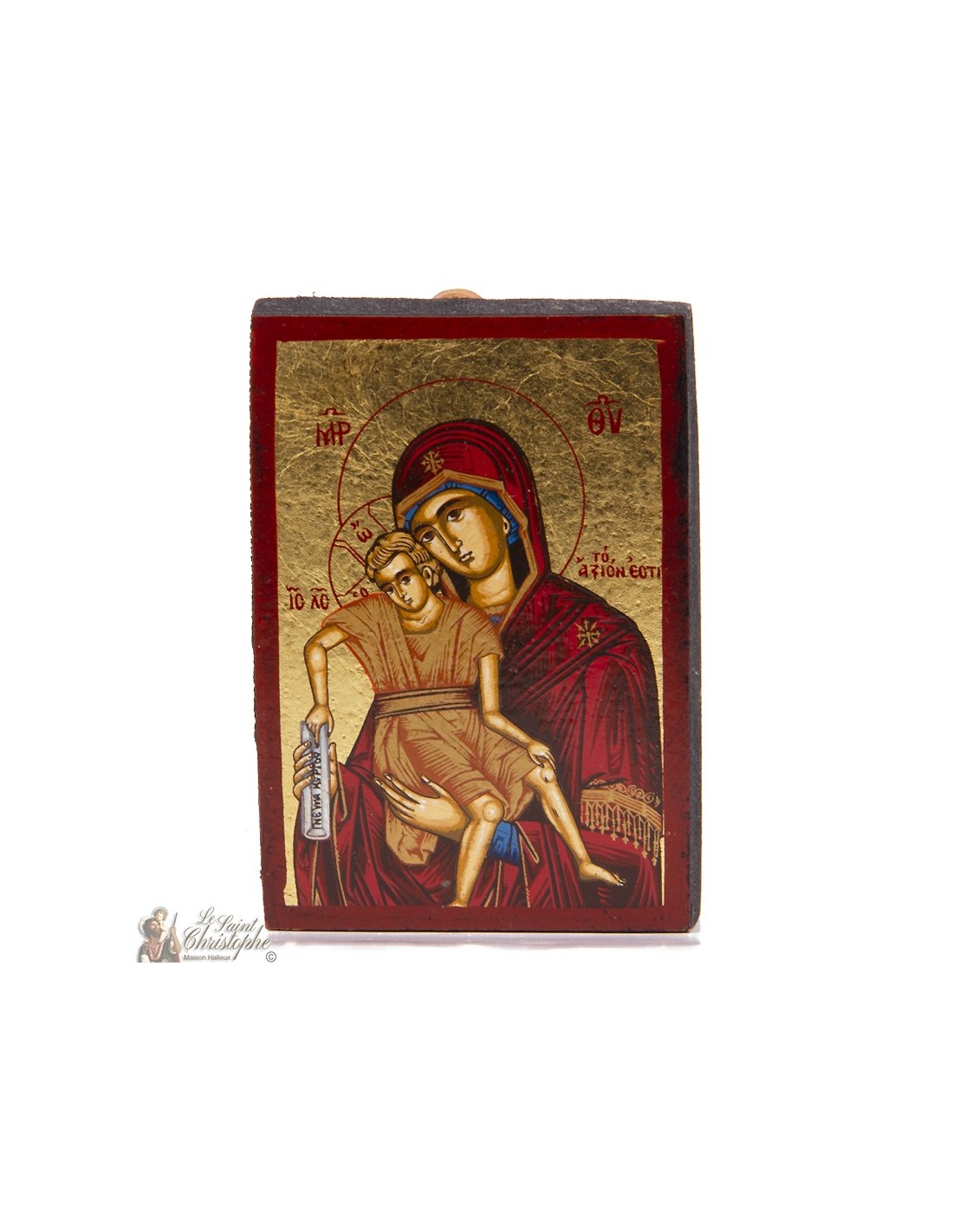 Cette icône orthodoxe représente la Vierge de la Dignité, appelée aussi "Axion Estin". Dans une posture solennelle, Marie porte l'Enfant Jésus bénissant, symbolisant la sagesse et la rédemption. Entourés d'un fond doré à la feuille, tous deux irradient de la lumière divine. Cette icône de 6 x 9 cm, réalisée sur bois, est une reproduction fidèle du style byzantin. Elle est parfaite pour un coin prière ou comme cadeau spirituel.