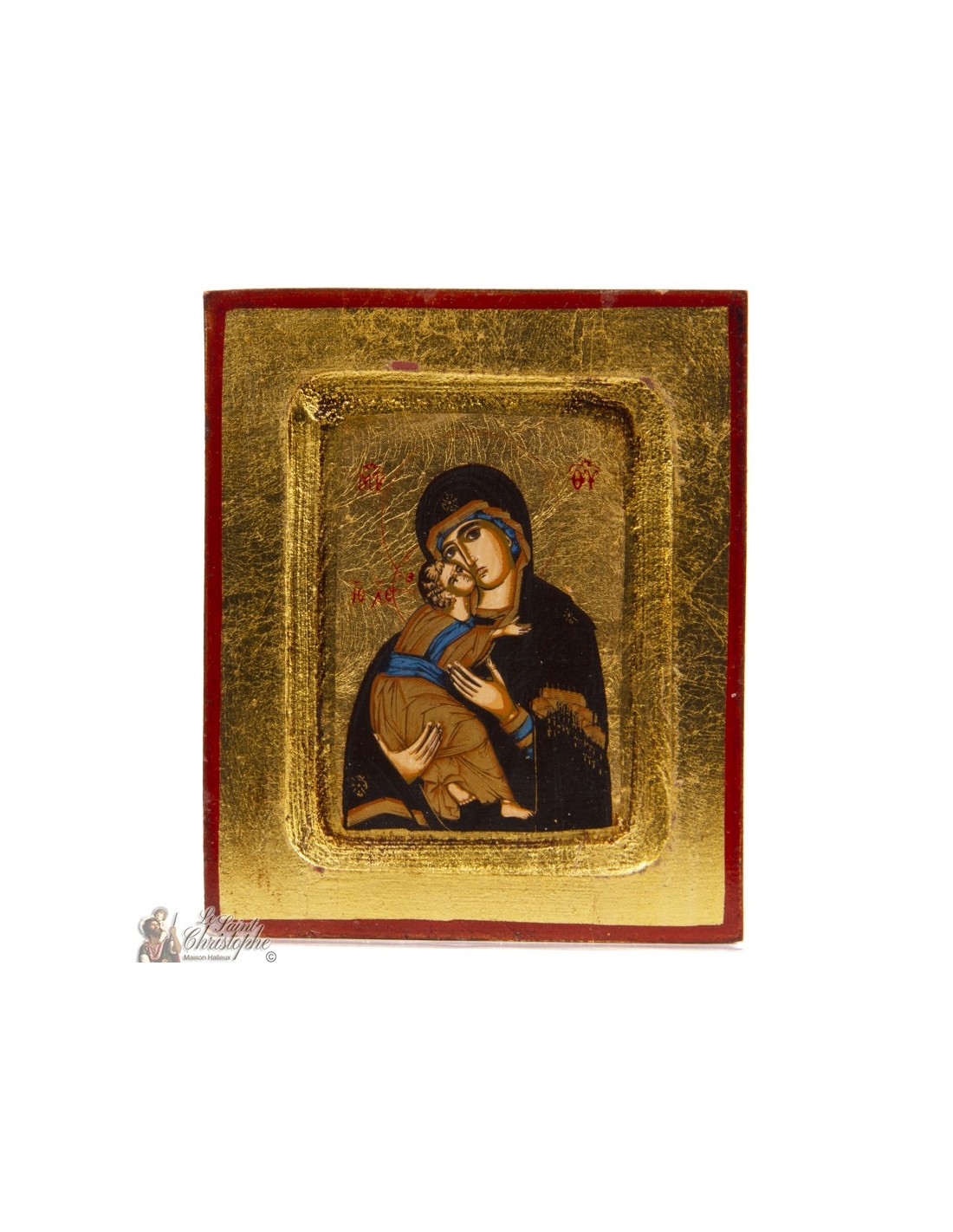 Cette icône de la Vierge de la Tendresse, est une œuvre d’art sacrée peinte à la main selon la tradition orthodoxe. Dorée à la feuille d’or, elle représente la Mère de Dieu tenant l’Enfant Jésus tendrement contre sa joue, dans une attitude pleine d’amour et de proximité. Un symbole profond d’amour maternel, de foi intime et de réconfort spirituel, idéale pour la prière ou comme présent de cœur.