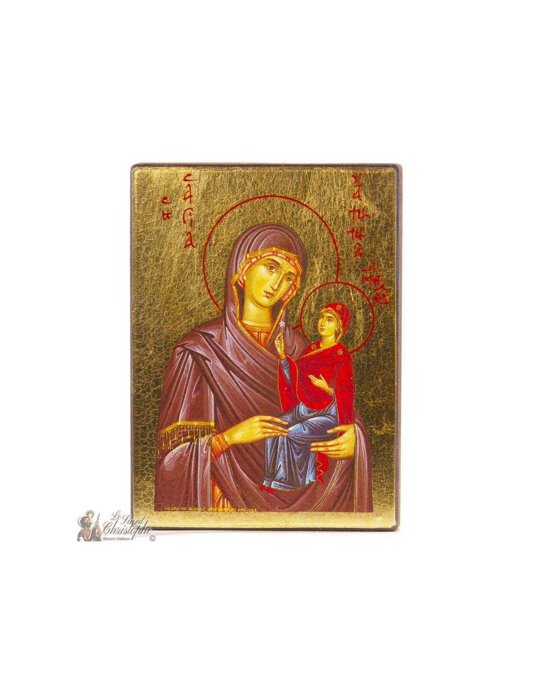 Cette icône orthodoxe dépeint Sainte Anne, mère de la Vierge Marie, tenant dans ses bras sa fille encore enfant, déjà bénie et sacrée. Réalisée à la main sur bois doré à la feuille d’or, elle mesure 7,30 x 9,30 cm et pèse environ 80 g. Cette représentation rare et symbolique exprime la foi transmise de génération en génération. Un bel hommage aux racines de la spiritualité mariale, propice à la prière familiale.
