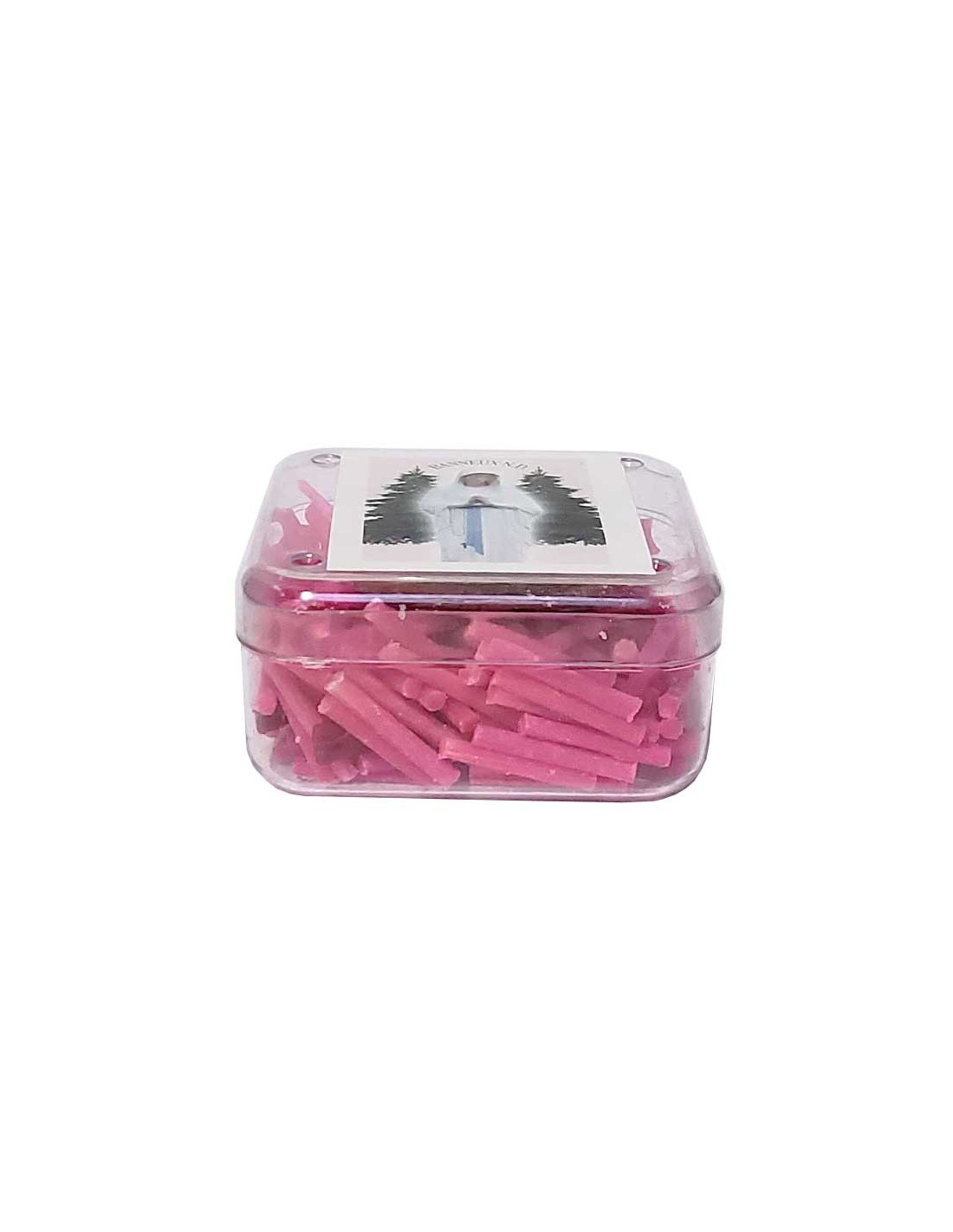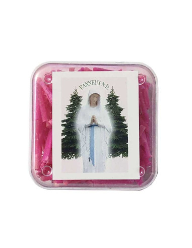 Boîte d'environ 200 mèches pour lampe à huile. La boîte est décorée d'une image de la Vierge des Pauvres de Notre Dame de Banneux, et contient une pince et un flotteur en liège.