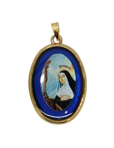 Médaille de Sainte Rita en résine colorée et métal doré. Ce grand pendentif fantaisie est ovale. Le recto est à l'image de Saint Rita, légèrement irisée, recouverte d'une couche de résine protectrice avec effet brillant. Le dos est d'un beau bleu profond et translucide. Sainte Rita est la patronne des femmes mal mariées, des causes désespérées et des choses impossibles.