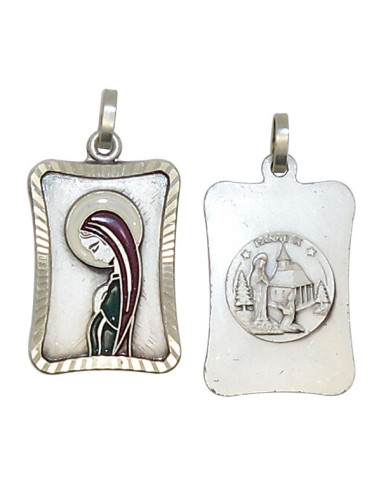 Médaille de la Vierge, pendentif fantaisie en métal argenté au style mêlant classique et moderne. La médaille est en forme de rectangle aux coins arrondis, les bords sont travaillés en une belle frise, faisant comme une fenêtre qui donne vue sur Marie. Le recto, avec la Sainte Vierge, est dans un style moderne avec des émaux colorés. Le verso est un bas-relief de l'apparition de la Vierge des Pauvres de Banneux Notre-Dame.