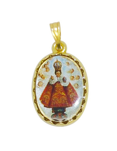 Médaille du Petit Jésus de Prague en émail transparent et métal doré, sans nickel. Ce petit pendentif fantaisie est ovale. Le recto est à l'image du Petit Jésus de Prague, légèrement irisée, recouverte d'une couche d'émail protecteur avec effet brillant.