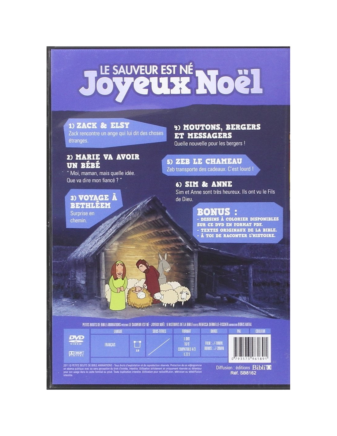DVD de 6 histoires autour de la naissance de Jésus. Outre ces petits clips drôles et touchants, le DVD comprend le texte original de la Bible lu en français courant par les personnages, 30 dessins à imprimer et à colorier en format PDF et même le jeu "à toi de raconter". Il s'agit d'une animation muette à faire raconter, doubler ou jouer par les enfants.