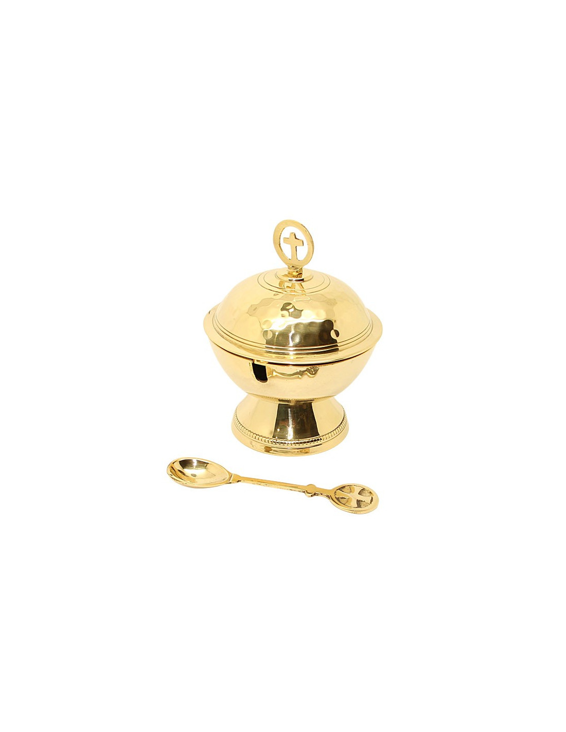 Récipient en cuivre travaillé à la main avec croix sur le couvercle + cuillère avec croix