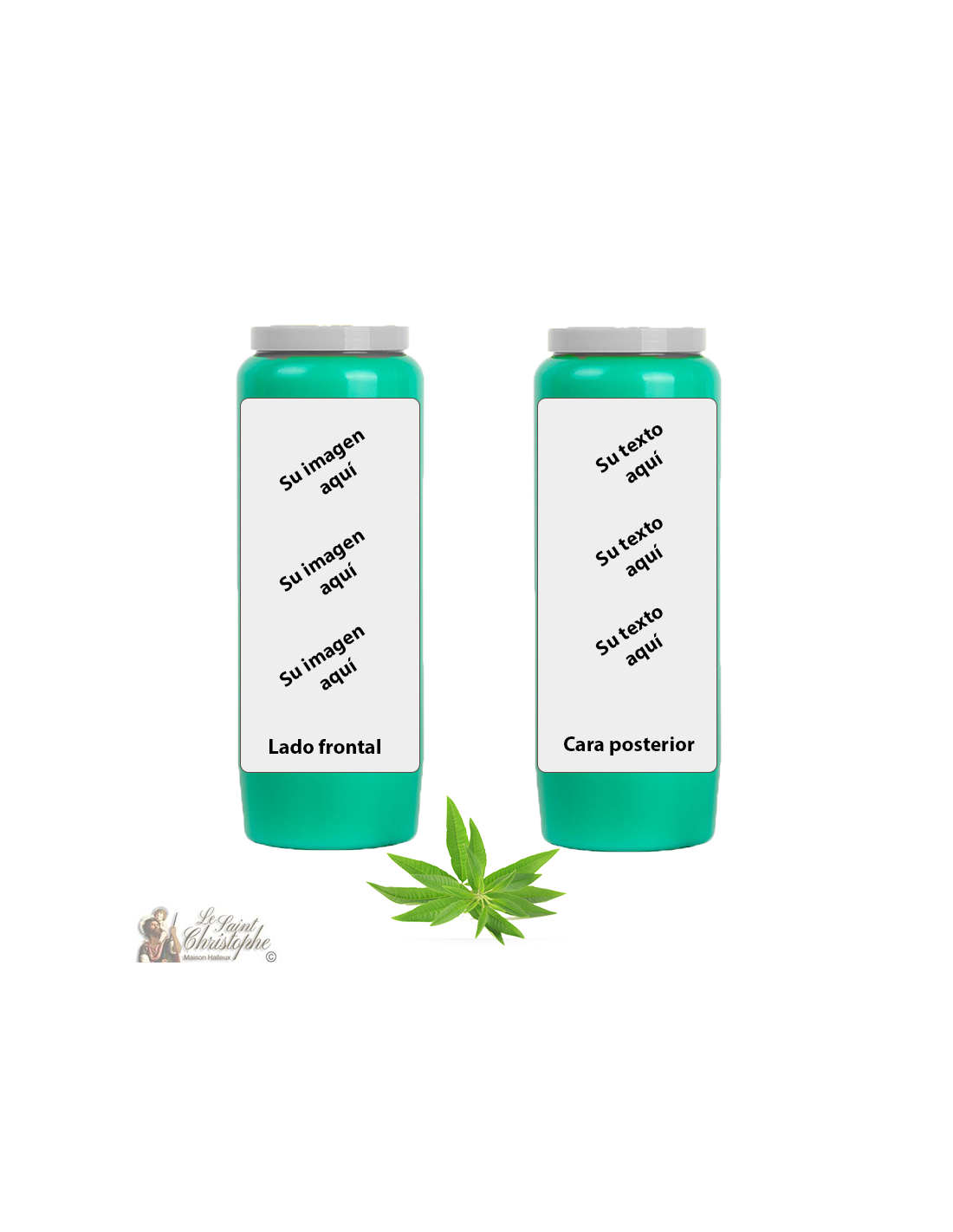 Bougie de neuvaine verte claire, parfumée à la verveine, personnalisable avec votre image et votre texte.