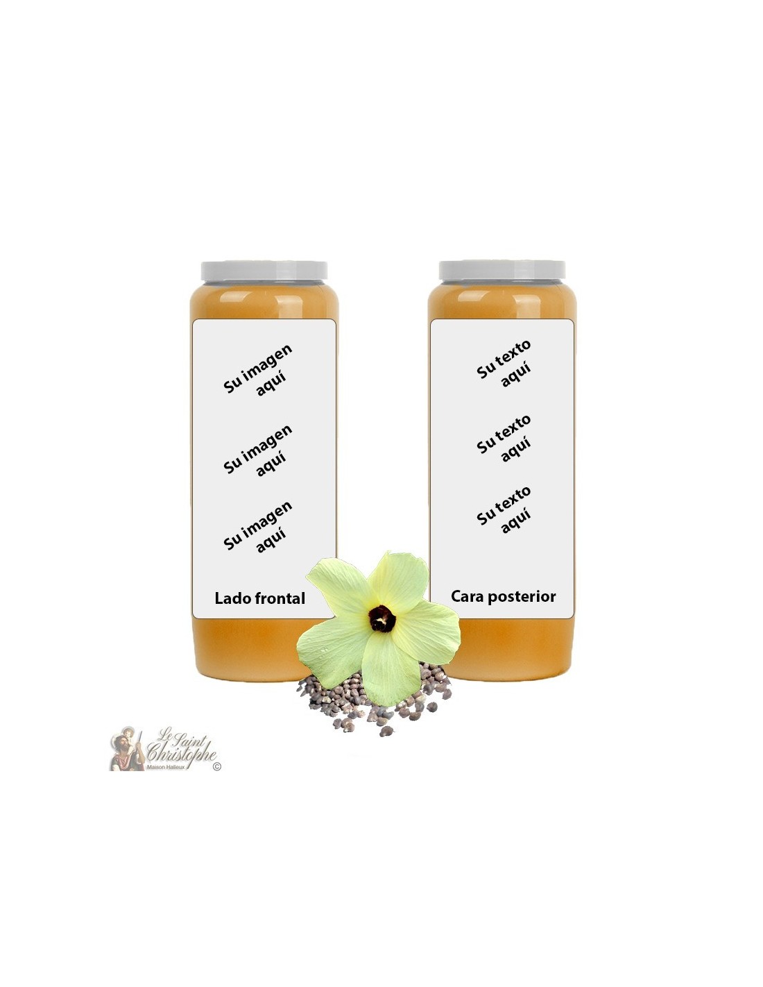 Bougie de neuvaine blanche, parfumée au musc, personnalisable avec votre image et votre texte.