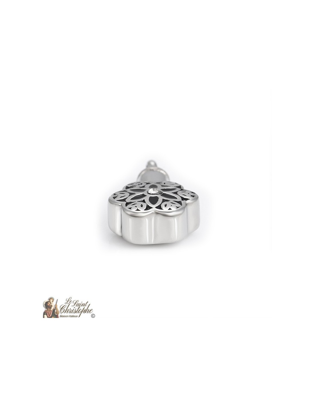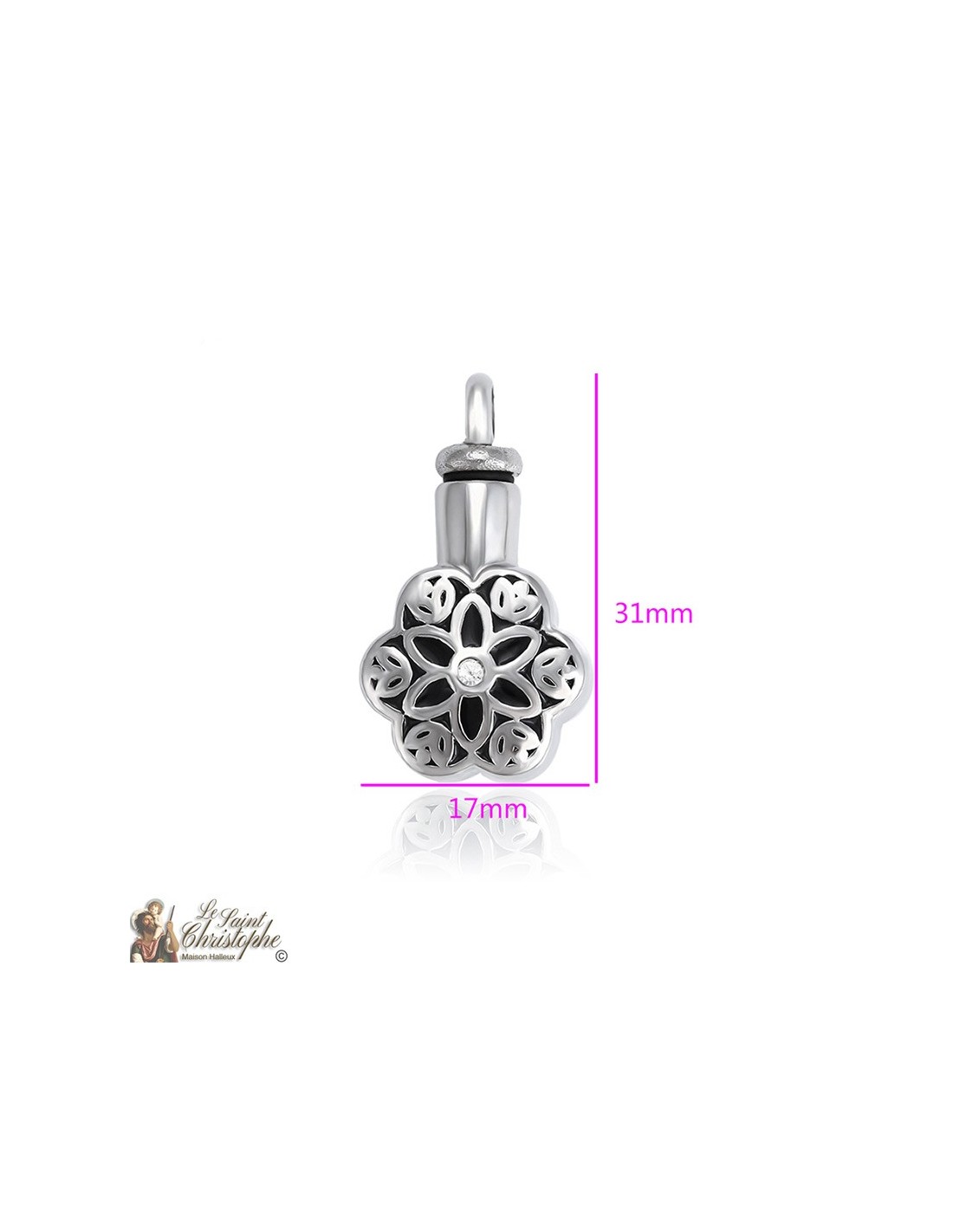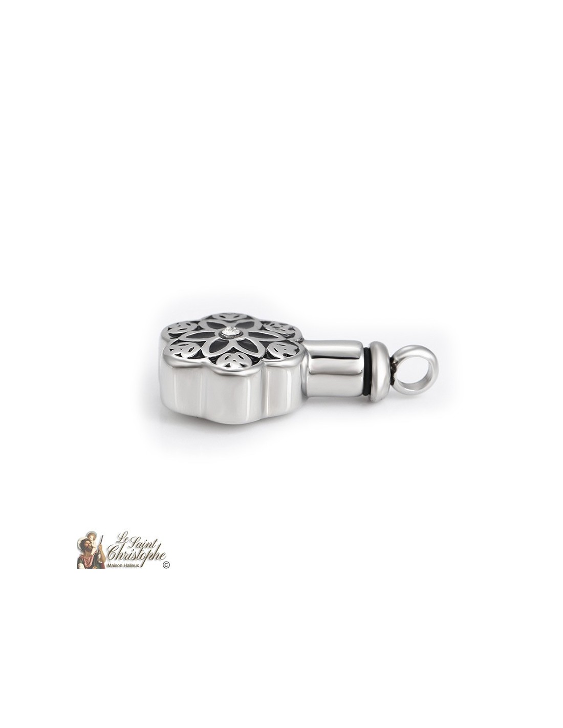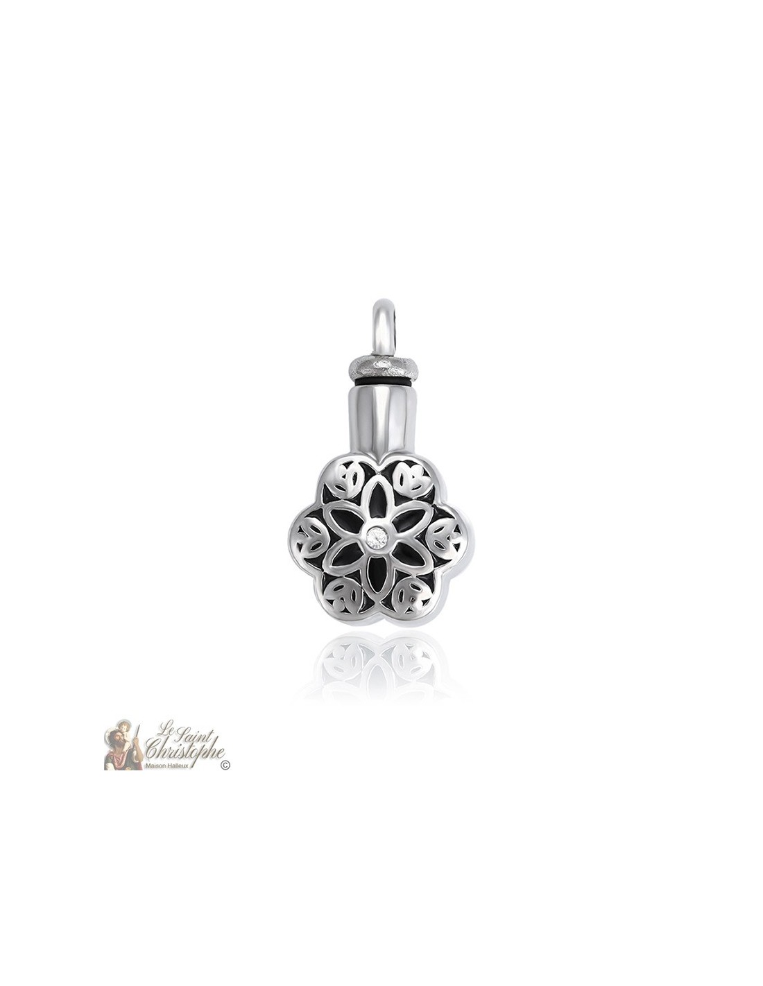 Pendentif cinéraire, pour accueillir des cendres funéraires, en acier inoxydable. Ce modèle est en forme de fleur finement travaillée, avec un fond noir pour la mettre en valeur, et un cristal en sn cœur.