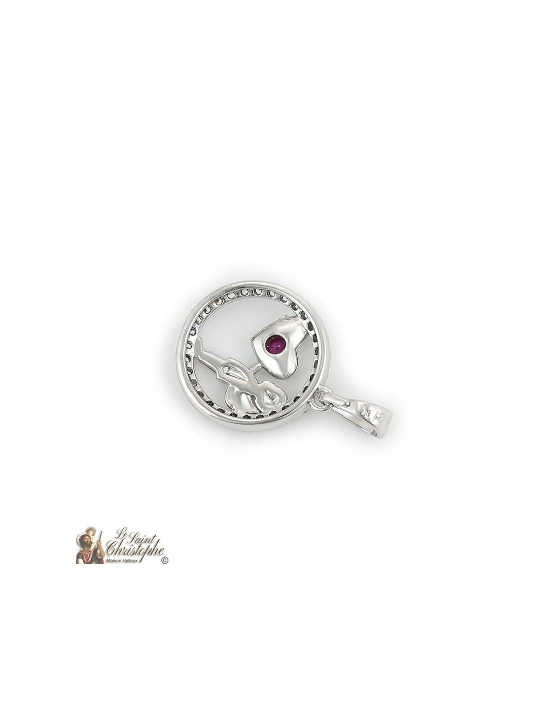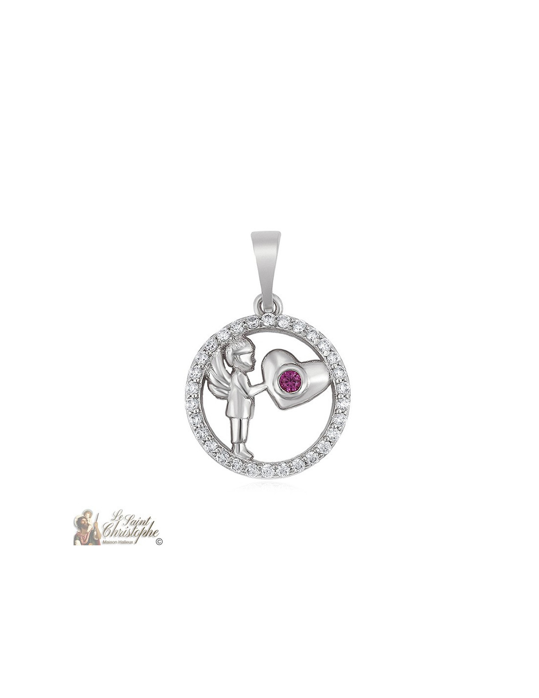 Pendentif en acier inoxydable. Il représente un petit garçon ailé ou un petit angelot tenant un cœur serti d'un cristal rose et entouré d'un anneau incrusté de plusieurs cristaux blancs. Son aspect argenté est une véritable petite lumière qui illumine le décolleté !