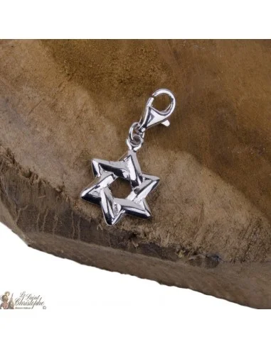 Ce pendentif représente une étoile de David joliment tressée. Le mousqueton permet d'accrocher le pendentif où vous le souhaitez, comme un bracelet, un collier ou même une chaîne de cheville.