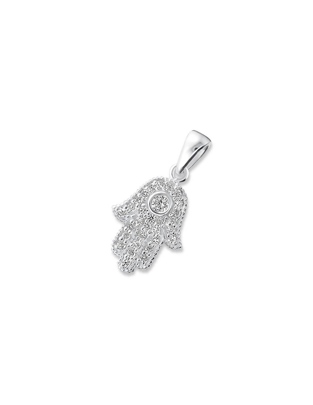 Pendentif en véritable argent 925 et incrusté de petits cristaux strass blancs. Il est en forme de Main de Fatma, un symbole ancestral de protection très populaire dans le Proche et le Moyen-Orient. Il repousse les énergies négatives et le mauvais œil, favorisant ainsi la chance et la prospérité.