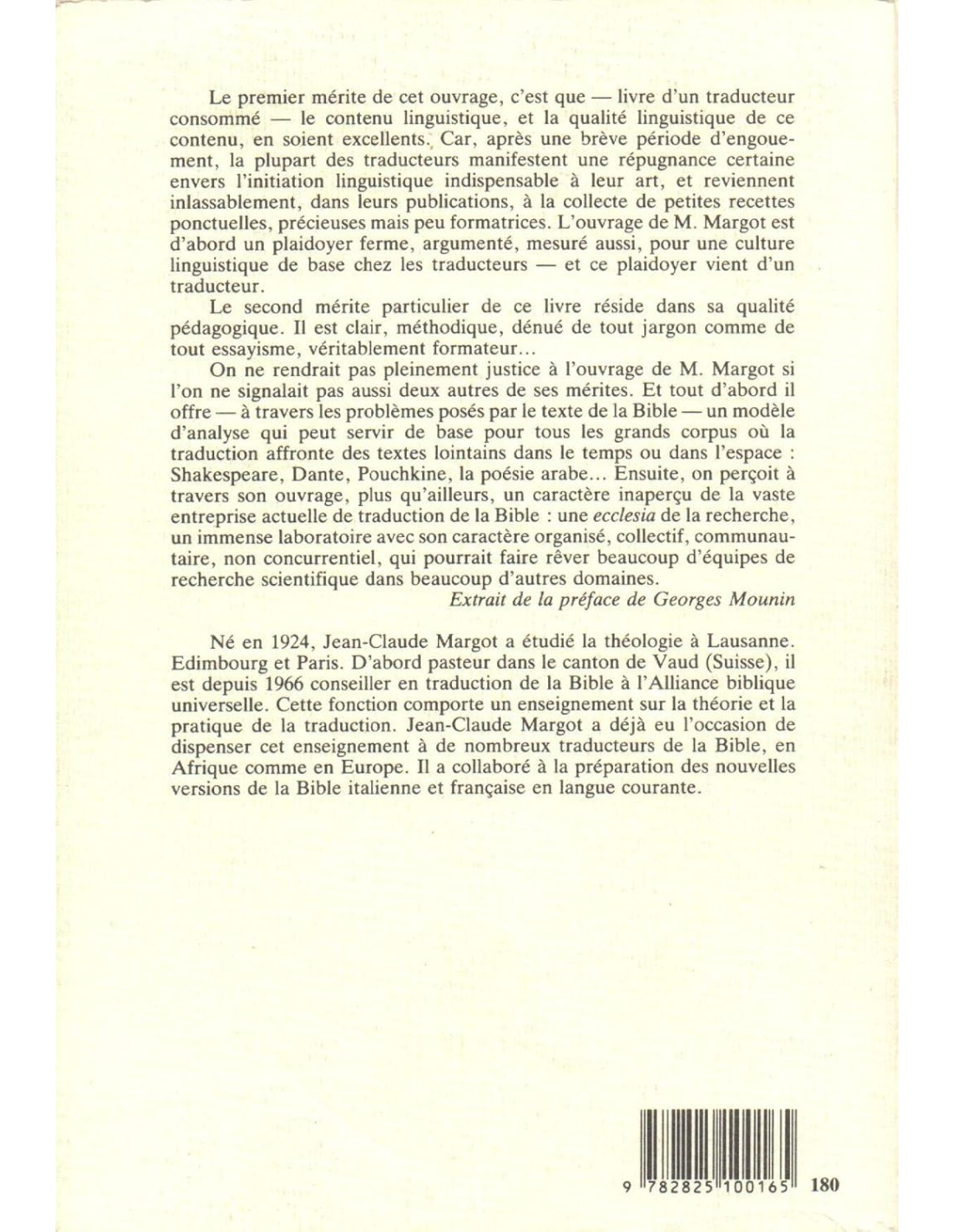 Le premier mérite de cet ouvrage, c'est que - livre d'un traducteur consommé - le contenu linguistique, et la qualité linguistique de ce contenu, en soient excellents. Car, après une brève période d'engouement, la plupart des traducteur manifestent une répugnance certaine envers l'initiation linguistique indispensable à leur art, et reviennent inlassablement, dans leurs publications, à la collecte de petites recettes ponctuelles, précieuses mais peu formatrices. L'ouvrage de M. Margot est d'abord un plaidoyer ferme, argumenté, mesuré aussi, pour une culture linguistique de base chez les traducteurs - et ce plaidoyer vient d'un traducteur.