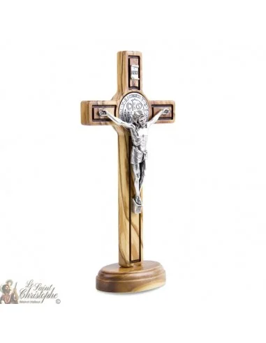 Cette croix sur socle est réalisée en bois d'olivier et la figure du Christ en métal argenté. L'effigie est délicatement ouvragée et ressort du crucifix. Le bois d'olivier est très reconnaissable avec son essence claire et le léger parfum qui l'accompagne. Il est réputé pour avoir de nombreuses symboliques, notamment l'immortalité, la paix, l'abondance et la prospérité. La médaille de Saint Benoît, en métal également, est incrustée dans le bois. Les branches de la croix sont décorées d'un contour intérieur, donnant un charme raffinée à l'objet.