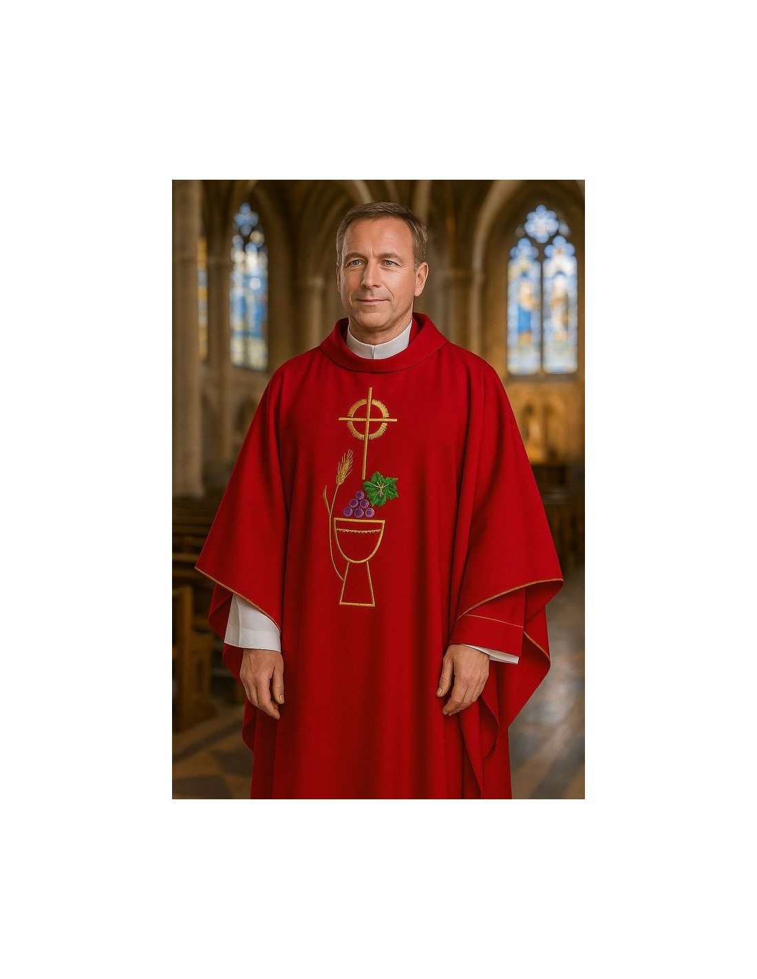 Chasuble rouge brodée avec calice et raisins – avec son étole