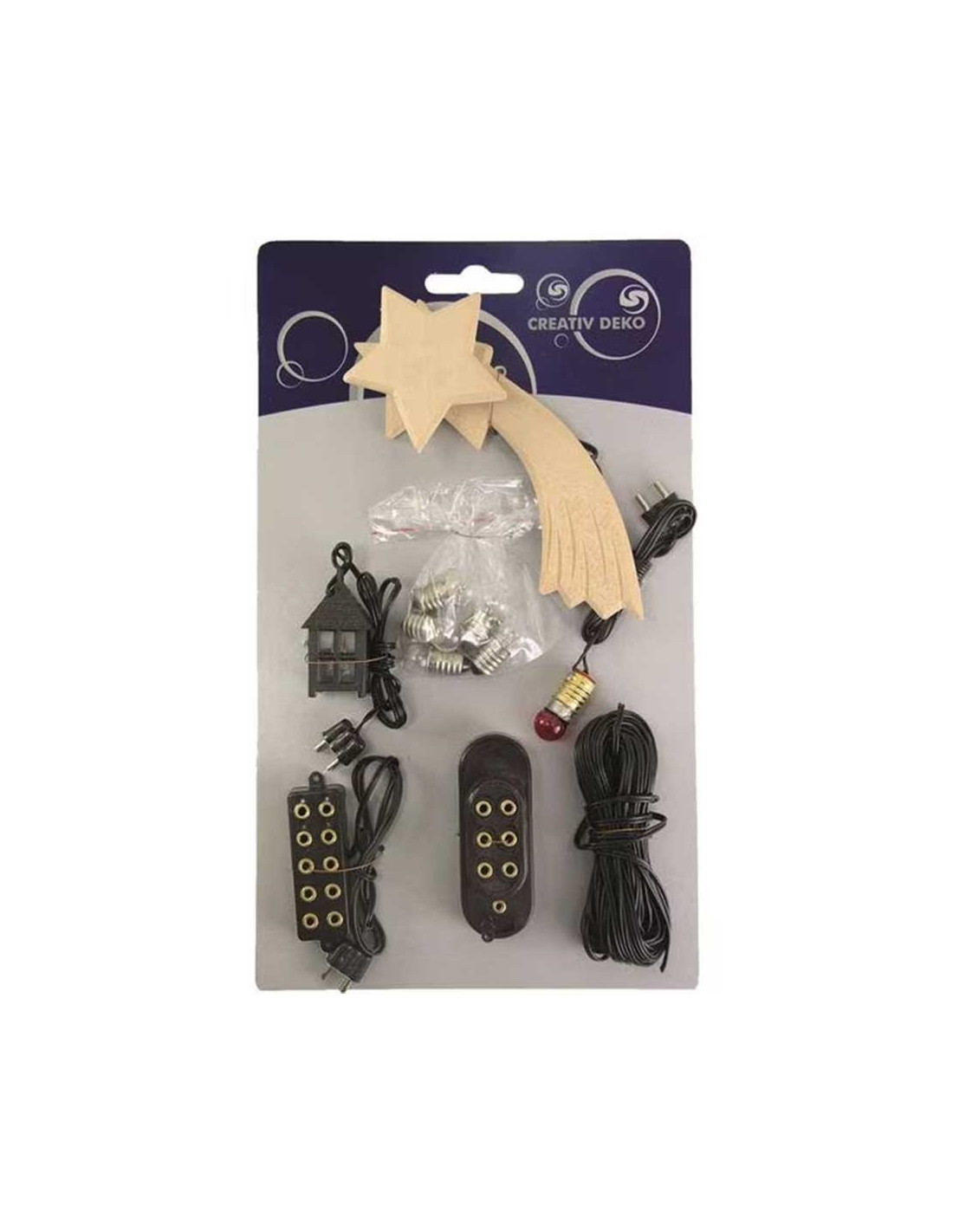 Questo kit di illuminazione per culle di Natale e villaggi di santoni è il modo perfetto per ravvivare le vostre decorazioni! Composto da una grande stella cadente in legno con lampadina, una lanterna nera con luce rossa, 5 piccole lampadine bianche, una lampadina rossa con cavo lungo, due trasformatori e un cavo di prolunga, questo kit è molto pratico per aggiungere qualche tocco di luce, mettere in risalto il vostro diorama o personalizzare la vostra culla.
