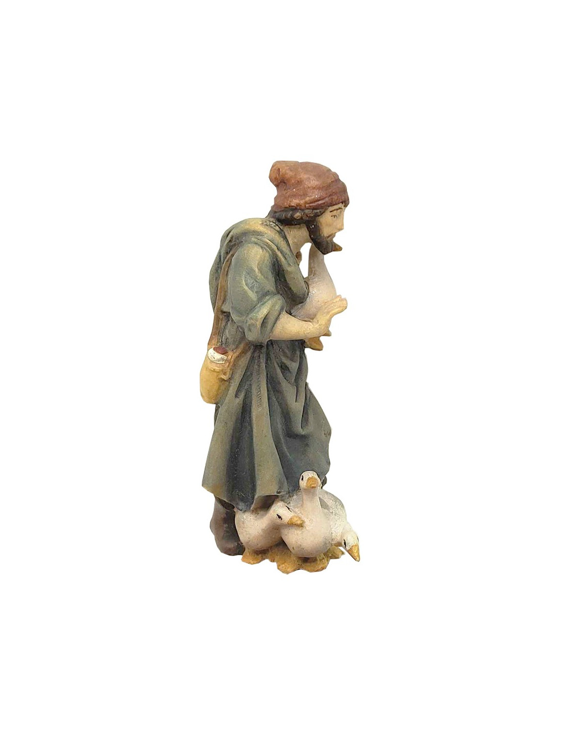 Statuetta di un pastore adulto in legno con finiture delicate, intagliata a mano. Questa statuetta è una bella aggiunta per un presepe natalizio, un villaggio di santoni, una casa delle bambole o un diorama, raffigurante un pastore che tiene in mano un'oca e alcune oche ai suoi piedi.