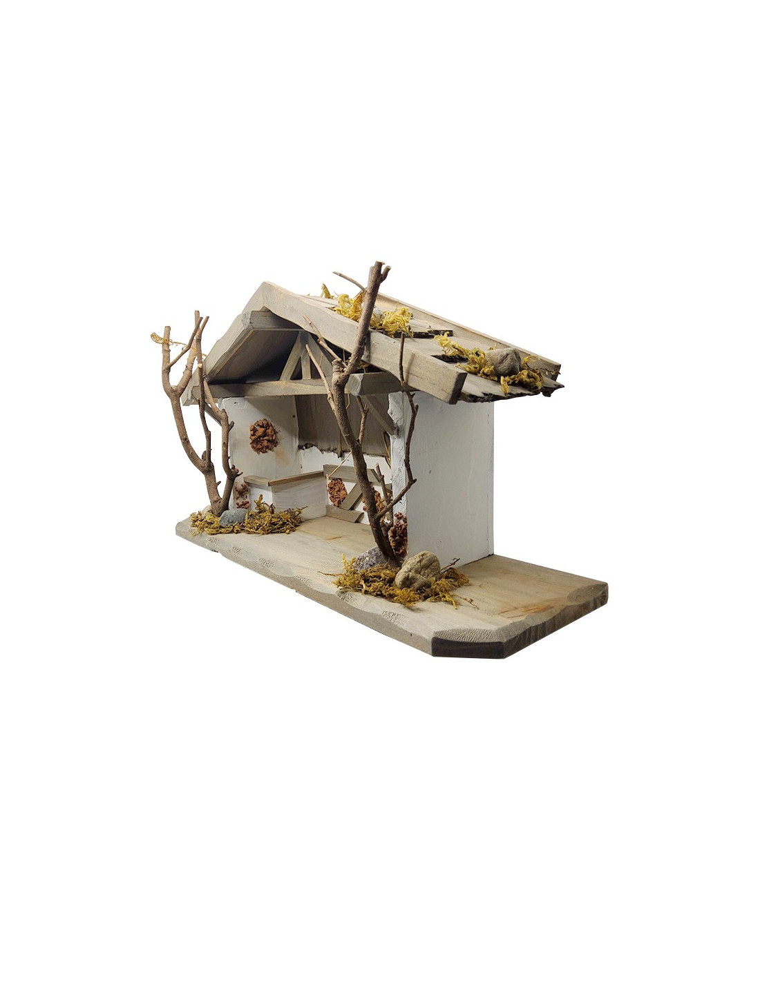 Materiali: legno naturale, muschio artificiale, paglia, frammenti di mattoni rossi, rami, pietre.