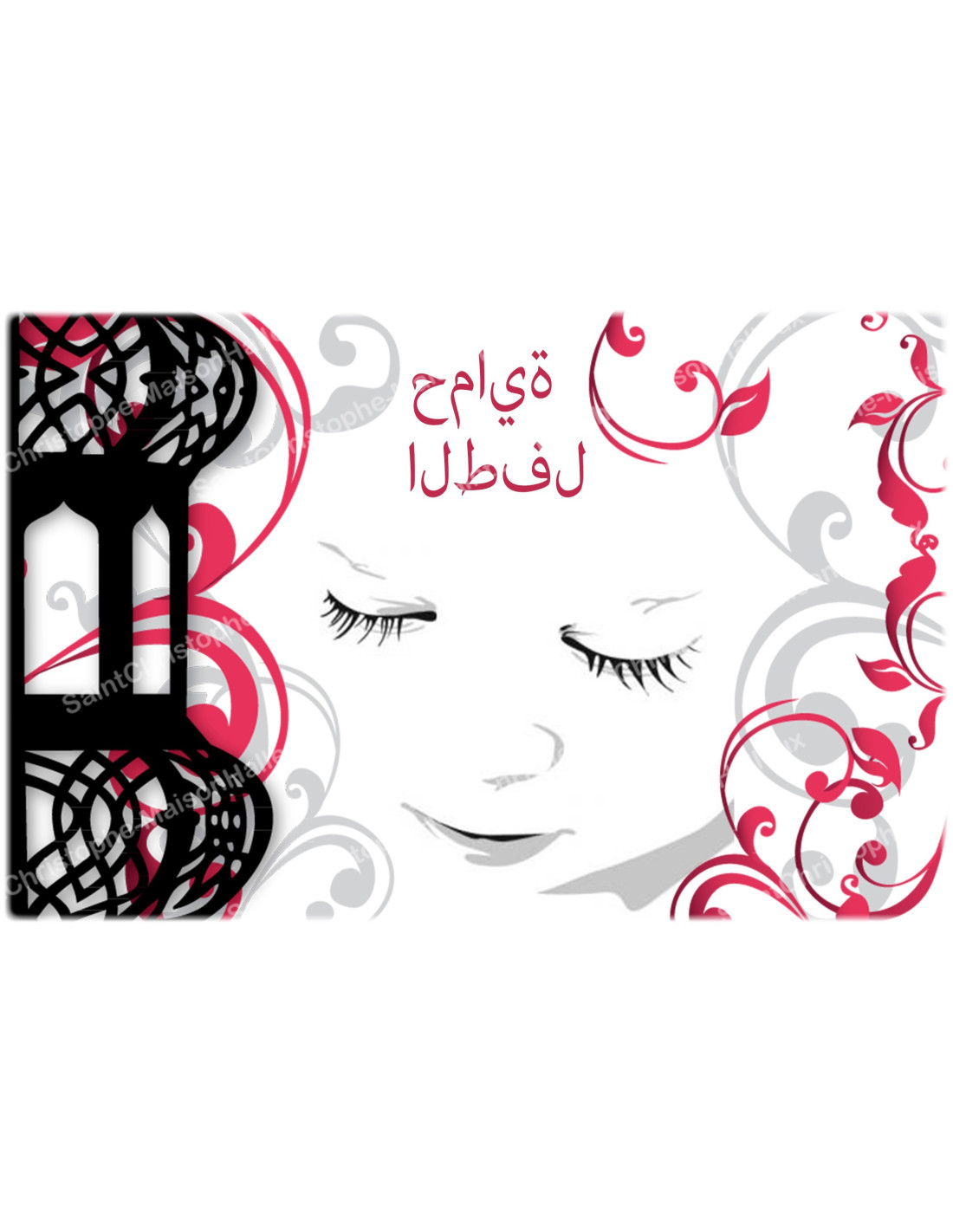 L'adesivo è decorato con il volto sereno di un bambino circondato da motivi e arabeschi, con la scritta “Protezione dei bambini” in arabo.