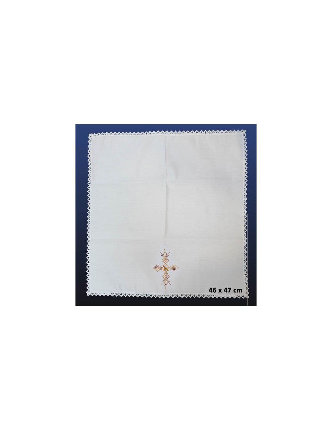 Questo set di lino di massa è ricamato con una croce stilizzata, mescolando fili d'oro e di bronzo. Tutti hanno un bordo di pizzo. Il tutto è stato fatto a mano.