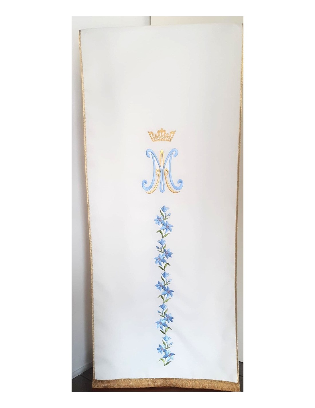 Velo da leggio con al centro il simbolo mariano. Il simbolo è una M blu reale circondata da motivi vegetali e sormontata da una corona a cinque punte arancione e oro. Il bordo del velo da leggio è ricamato con filo dorato e il bordo inferiore ha una frangia leggermente più lunga. Il colore del velo stesso è beige-crema. Motivi vegetali decorano il velo sotto il simbolo mariano.