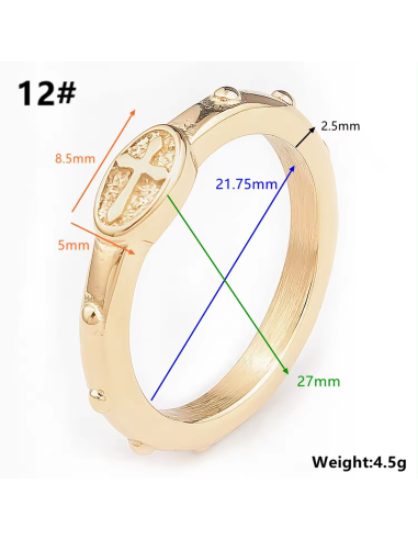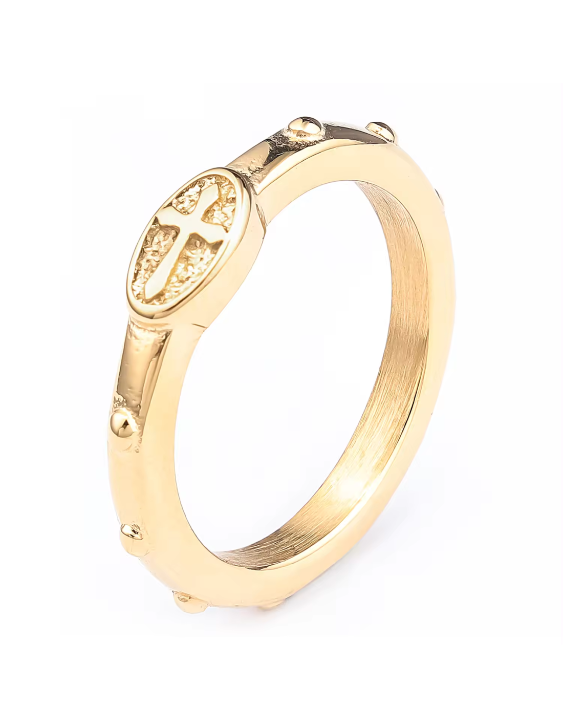 Anello in acciaio inossidabile e placcato oro 18 carati. Con i suoi punti tutt'intorno e la croce in alto, serve anche come porta rosario, permettendoti di pregare il rosario ovunque senza impedimenti! Sottile e delicato, è un gioiello pratico e bello che può essere indossato con tutto, con l'oro adatto a qualsiasi vestito o occasione.