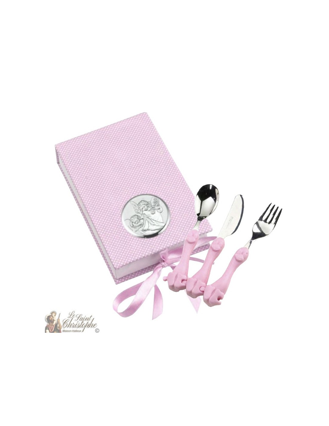 Set rosa di tre posate d'argento (forchetta, cucchiaio e coltello). Il manico ha la forma di piccoli pinguini che possono essere tagliati insieme.