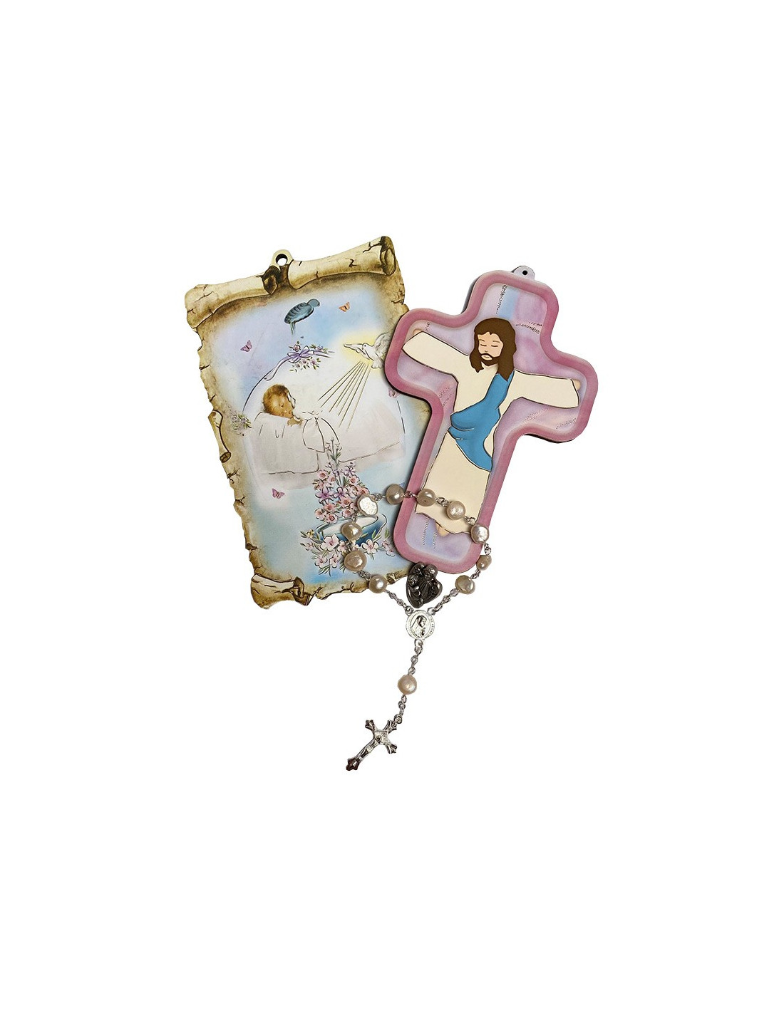 Regali di nascita per la protezione del neonato. Questo kit è composto da una targa da muro che imita una pergamena che rappresenta un battesimo, una targa da muro rosa con Gesù Cristo, un rosario in perle coltivate e una spilla dell'Angelo Custode.