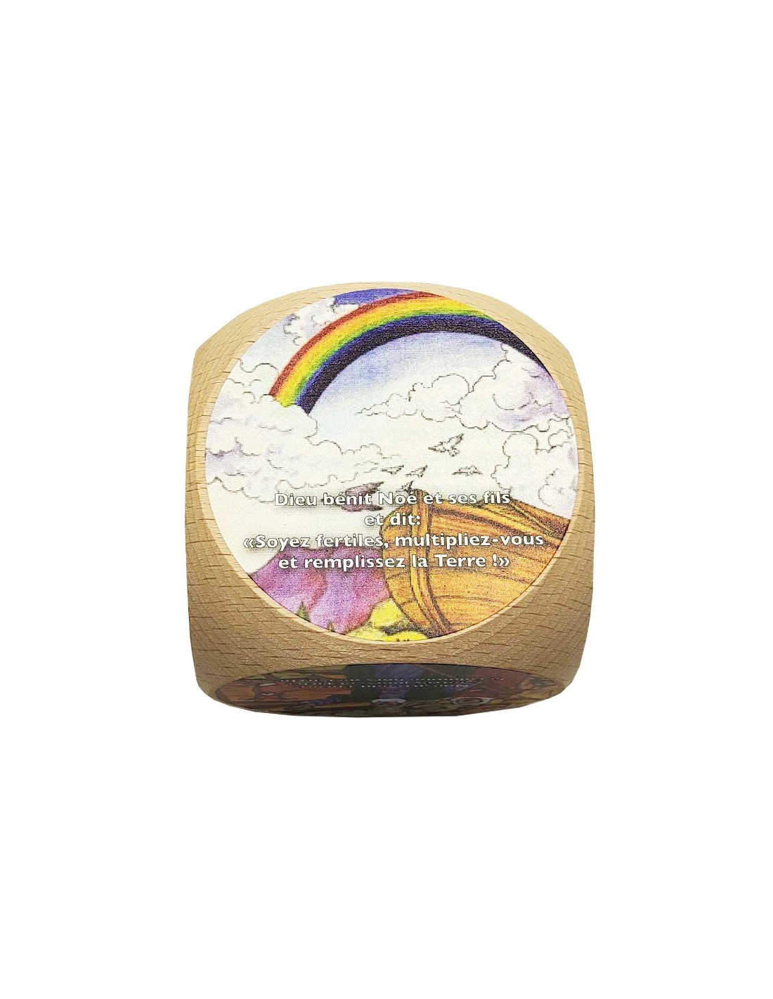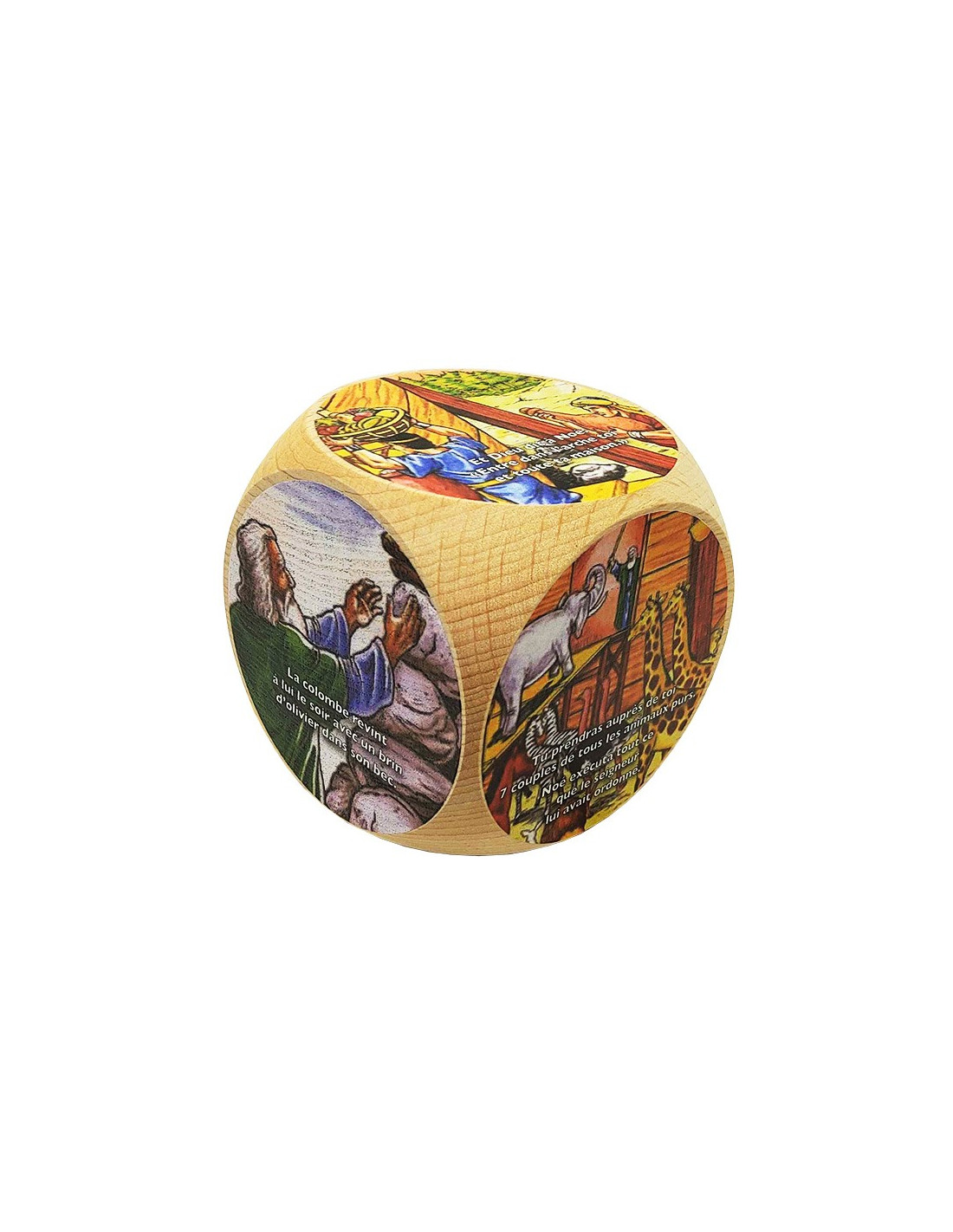 Un cubo di legno per l'apprendimento dei bambini. I lati sono illustrati con le tappe principali della storia dell'Arca di Noè, un racconto dell'Antico Testamento. I disegni, dai colori vivaci, sono accompagnati da un testo che spiega la scena rappresentata.