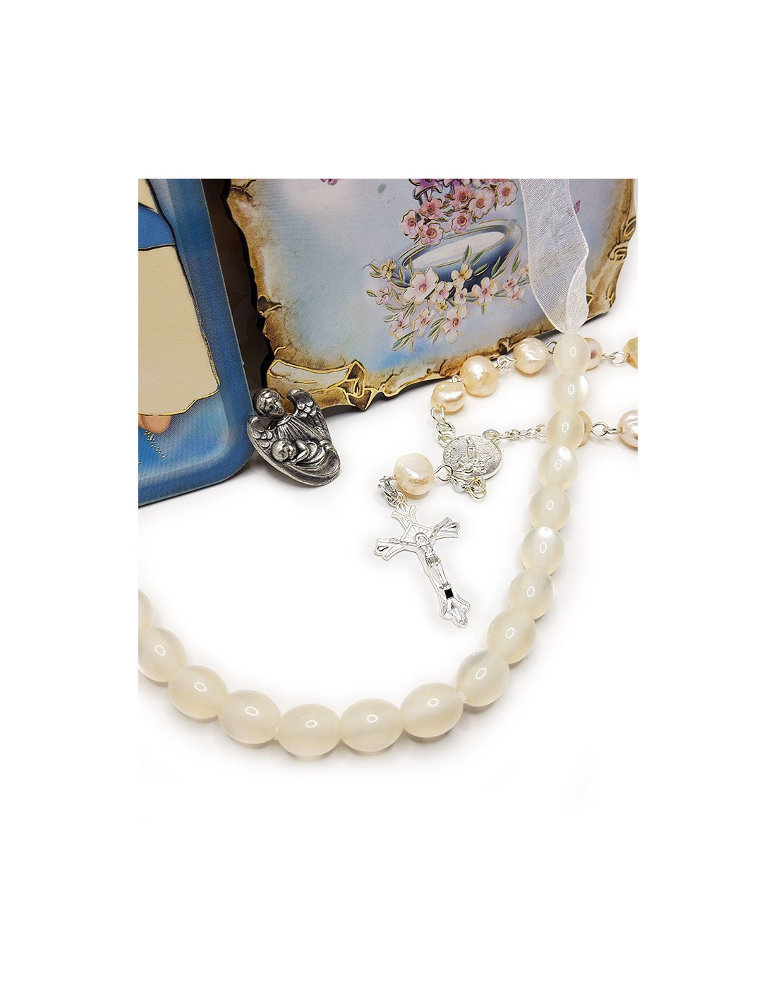 Per celebrare la nascita o il battesimo di un neonato, ecco la borsa regalo ideale! Contiene una collana per la dentizione, una croce da parete, un rosario decina in madreperla, una spilla con l'angelo custode e una targa da parete, ed è un regalo utile e spirituale per il neonato e la sua famiglia.