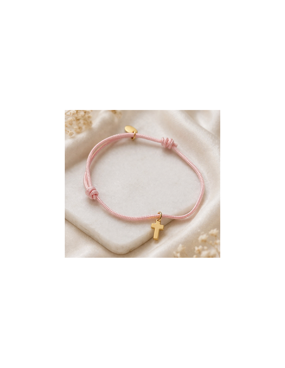Il cordino rosa dona un tocco femminile, mentre la croce dorata rappresenta fede, protezione e speranza.