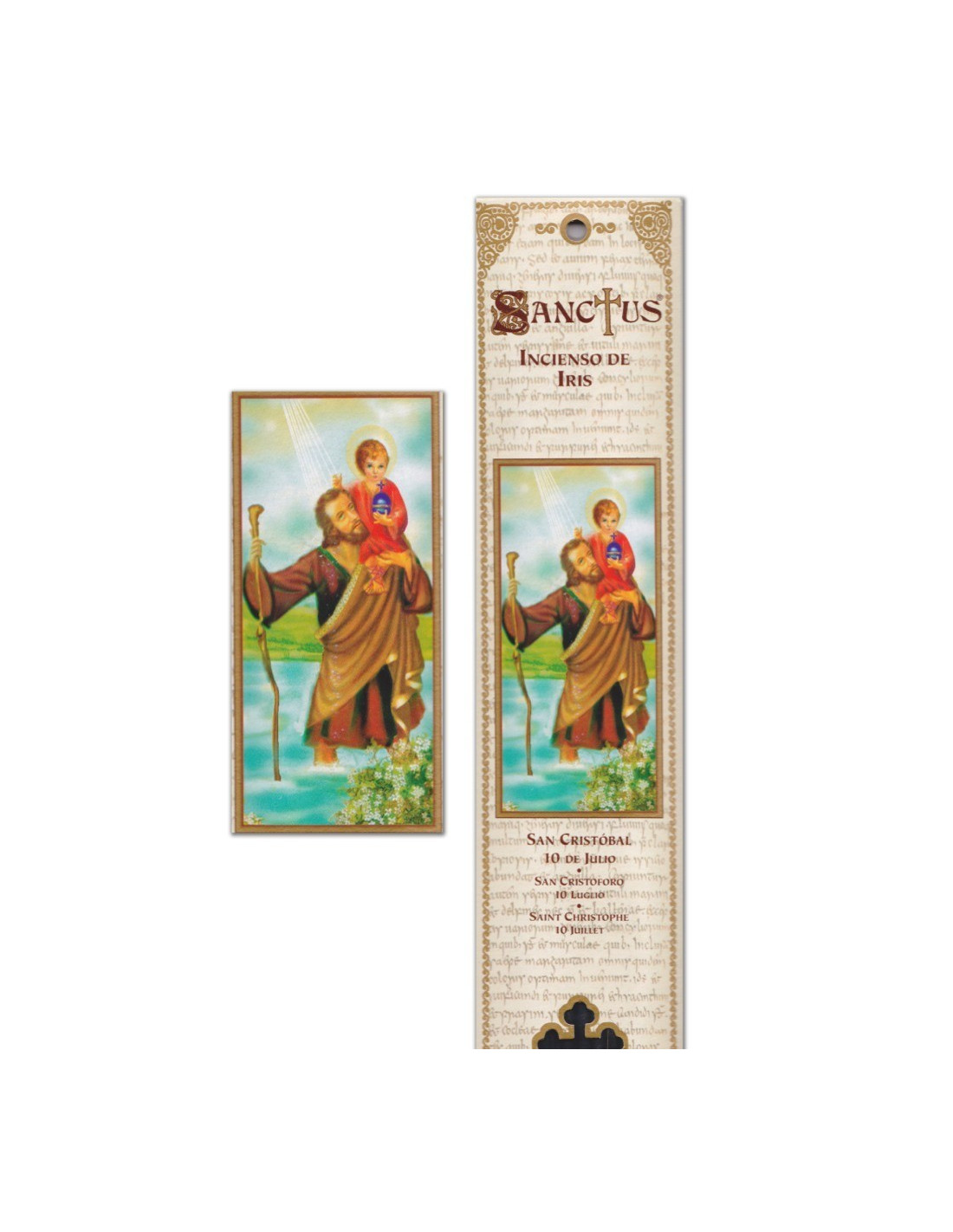 Questo sacchetto, con l'immagine di San Cristoforo che tiene un angelo sulla spalla dai colori brillanti e luminosi, contiene 15 bastoncini d'incenso naturale al profumo di iris. Si prega principalmente il 10 luglio. Questo incenso incantevole è usato principalmente per benedire i viaggi, per la protezione della famiglia e dei bambini.