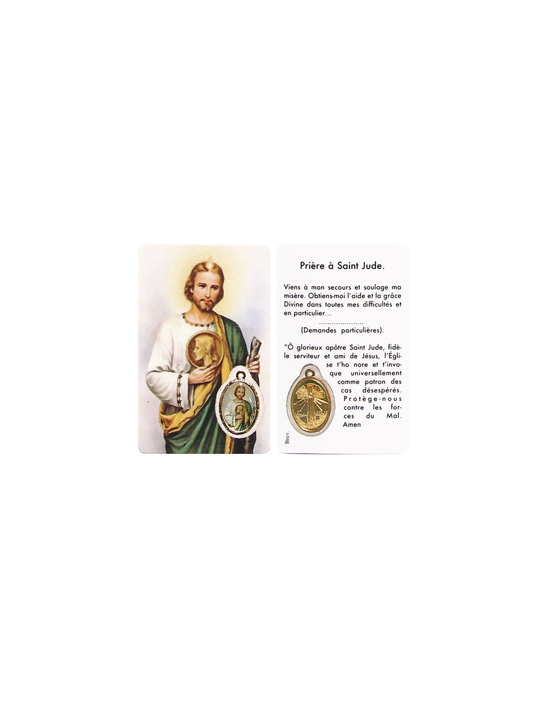 Questa medaglia-scheda onora San Giuda. La carta è stampata con un dipinto di San Giuseppe e una preghiera in suo nome. È decorato con una medaglia di San Giuda, che puoi ritagliare per indossarla come ciondolo o lasciarla con la carta come ricordo. La preghiera scritta sulla carta è una richiesta di aiuto, per alleviare una situazione difficile e alleviare la miseria.