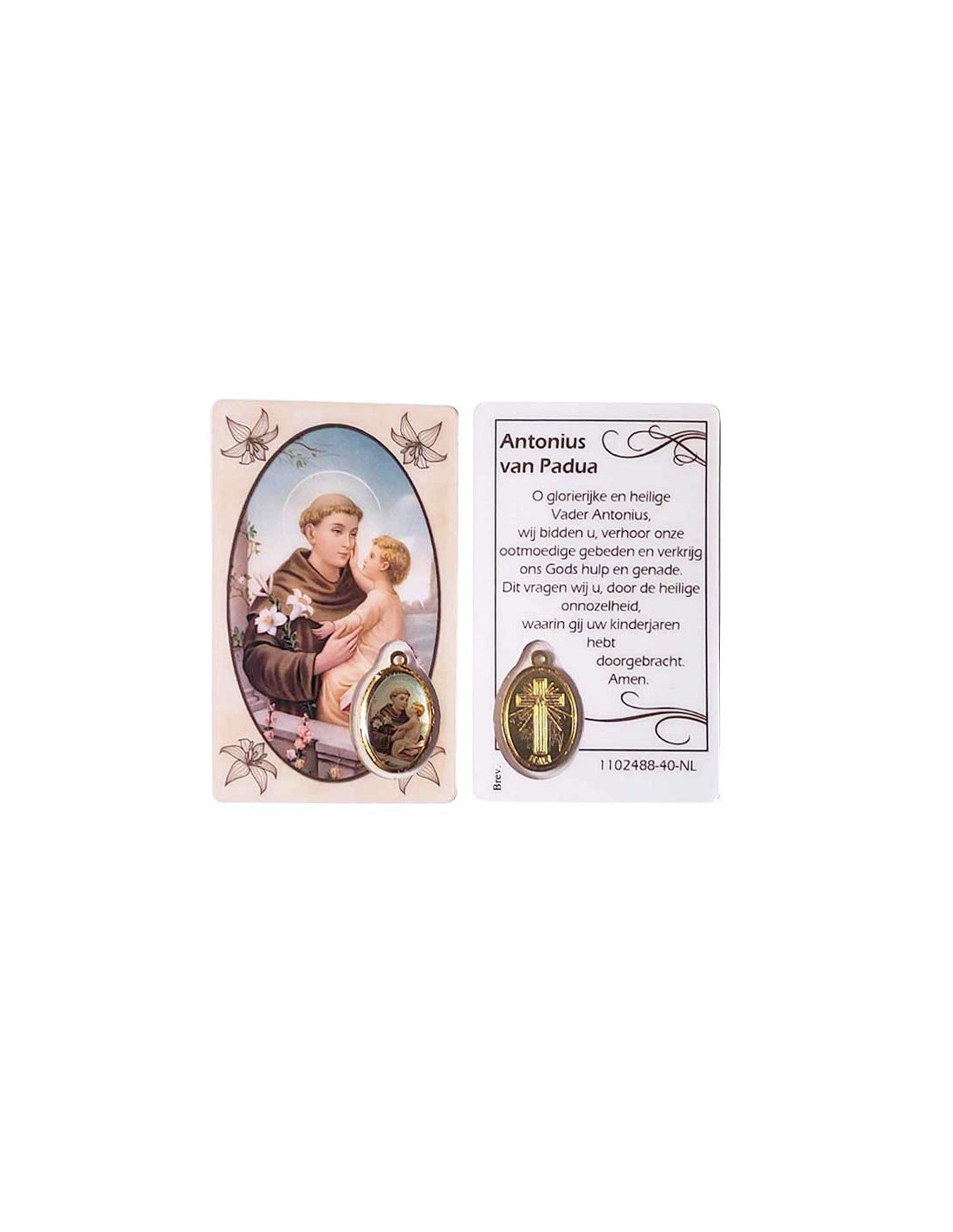Questa medaglia-scheda onora Sant'Antonio. La carta è stampata con un dipinto di Sant'Antonio e una preghiera in suo nome, e può essere portata in tasca o nel portafoglio. È ornato da una medaglia placcata in oro di Sant'Antonio che tiene in braccio un bambino, che può essere ritagliata per essere indossata come un ciondolo o lasciata con la carta come ricordo.