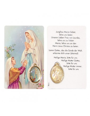 Questa medaglia-scheda onora Nostra Signora di Lourdes. Adatta a una tasca o a un portafoglio, la carta laminata è stampata con un dipinto della Madonna durante la sua apparizione e una preghiera in suo nome. È ornato da una medaglia dell'Apparizione di Nostra Signora di Lourdes a Bernadette Soubirous, che puoi ritagliare per indossarla come ciondolo o lasciarla con la carta come ricordo.