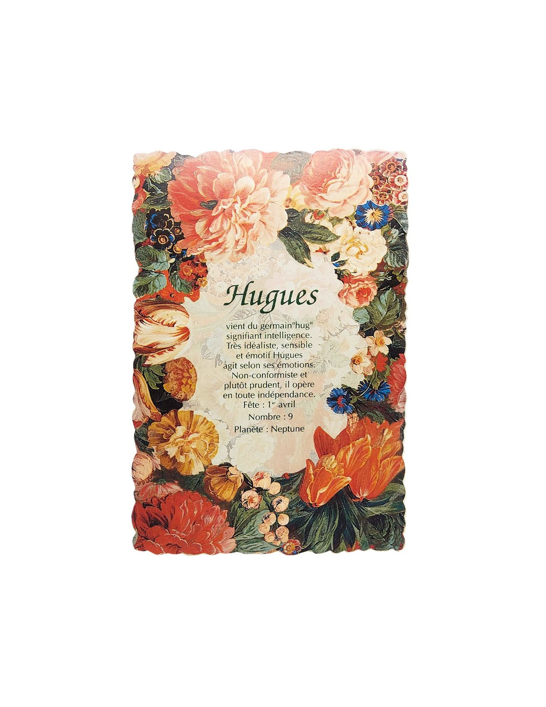 Cartolina di nome per persone di nome Hughes, decorata con fiori, con significato del nome, carattere, giorno di festa, numero fortunato e pianeta. Un'idea regalo originale e delicata.