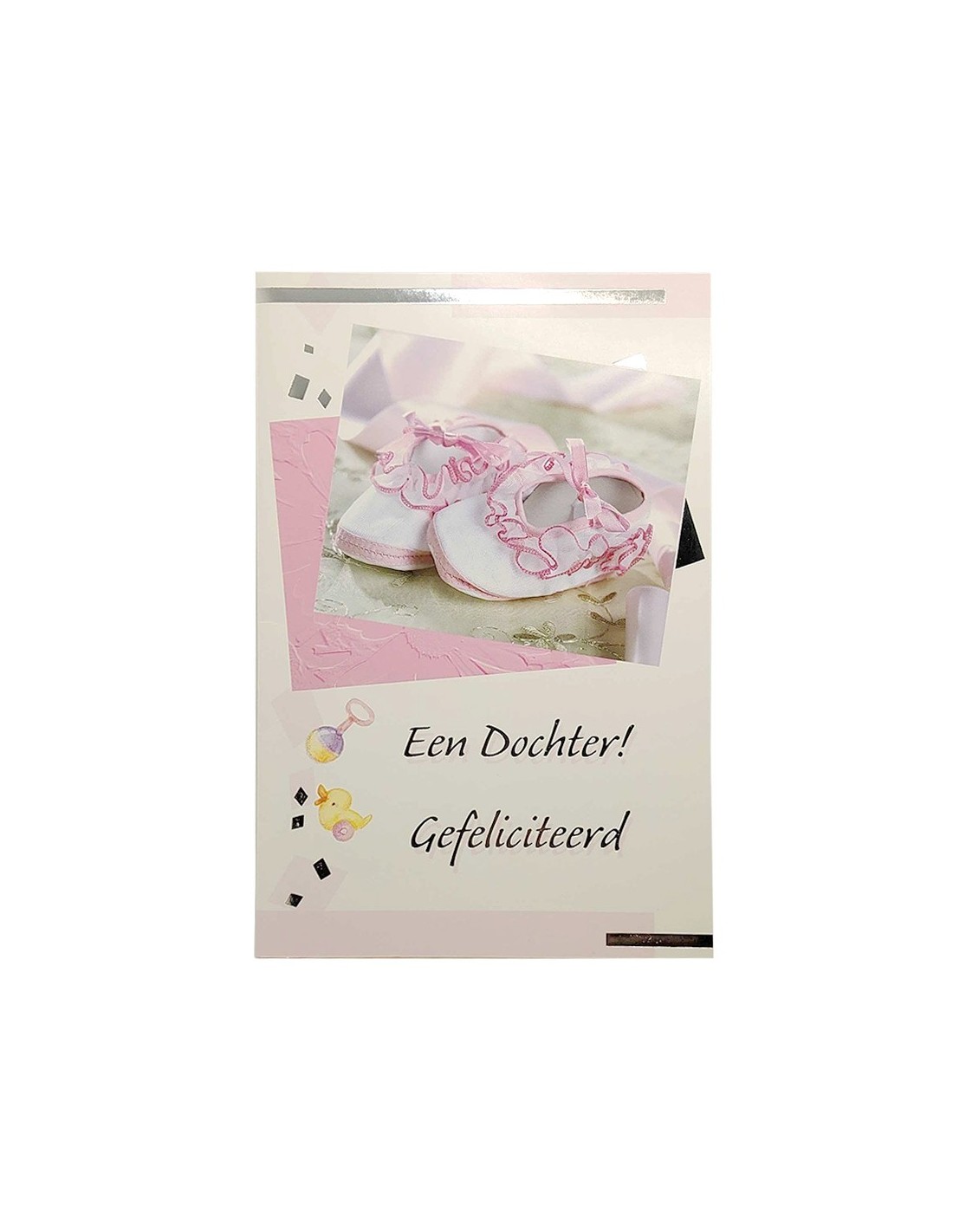 Festeggiate l'arrivo di una bambina con questo delicato e grazioso biglietto di auguri. In copertina, la foto delle scarpine rosa con un bellissimo pizzo è accompagnata da decorazioni argentate lucide che mettono in risalto il testo. All'apertura, un breve messaggio si congratula con la famiglia per la nascita e la invita a godersi questo piccolo miracolo, lasciando spazio per un messaggio personalizzato. Il testo in olandese recita "Una bambina! Congratulazioni" sul fronte e "Goditi questa piccola meraviglia" all'interno del biglietto.