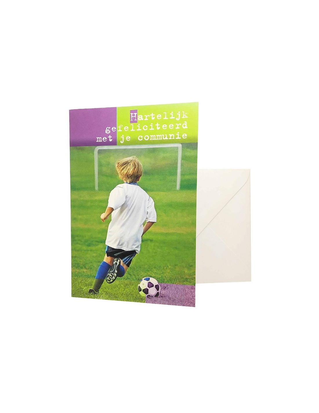 Congratulatevi con un bambino per la sua comunione con questo biglietto di auguri. Decorato con una foto di un bambino che gioca a calcio sul prato, questo biglietto è un pensiero commovente e delicato che vi permetterà di condividere una parola dolce con il giovane comunicando. Semplice e intramontabile, è ideale per esprimere le vostre congratulazioni al bambino che si impegna maggiormente nella vita cristiana. L'interno del biglietto è vuoto, per dare libero sfogo alla vostra immaginazione e scrivere un messaggio personalizzato al giovane comunicando. Il biglietto è fornito con una busta abbinata. Il testo è solo in olandese.