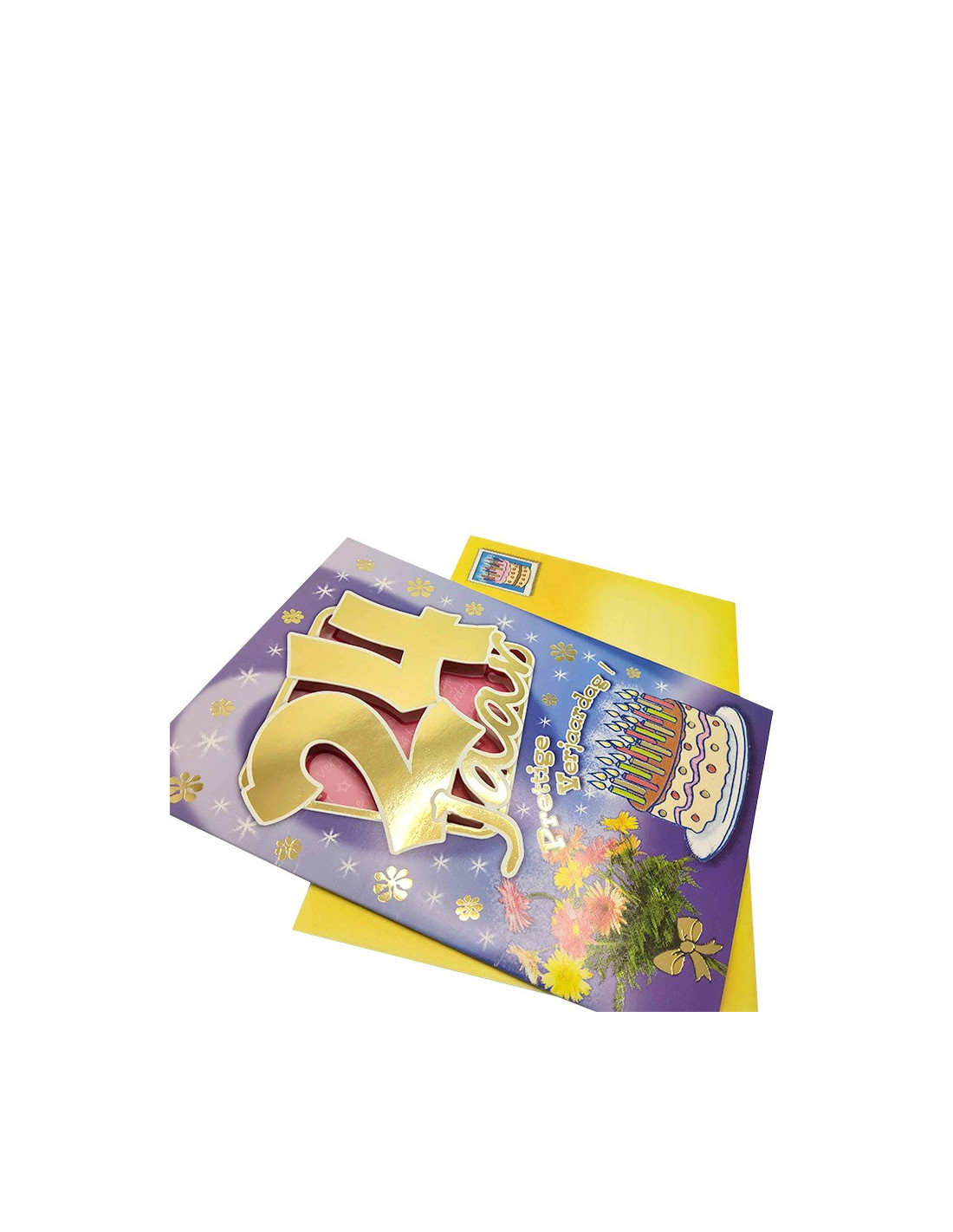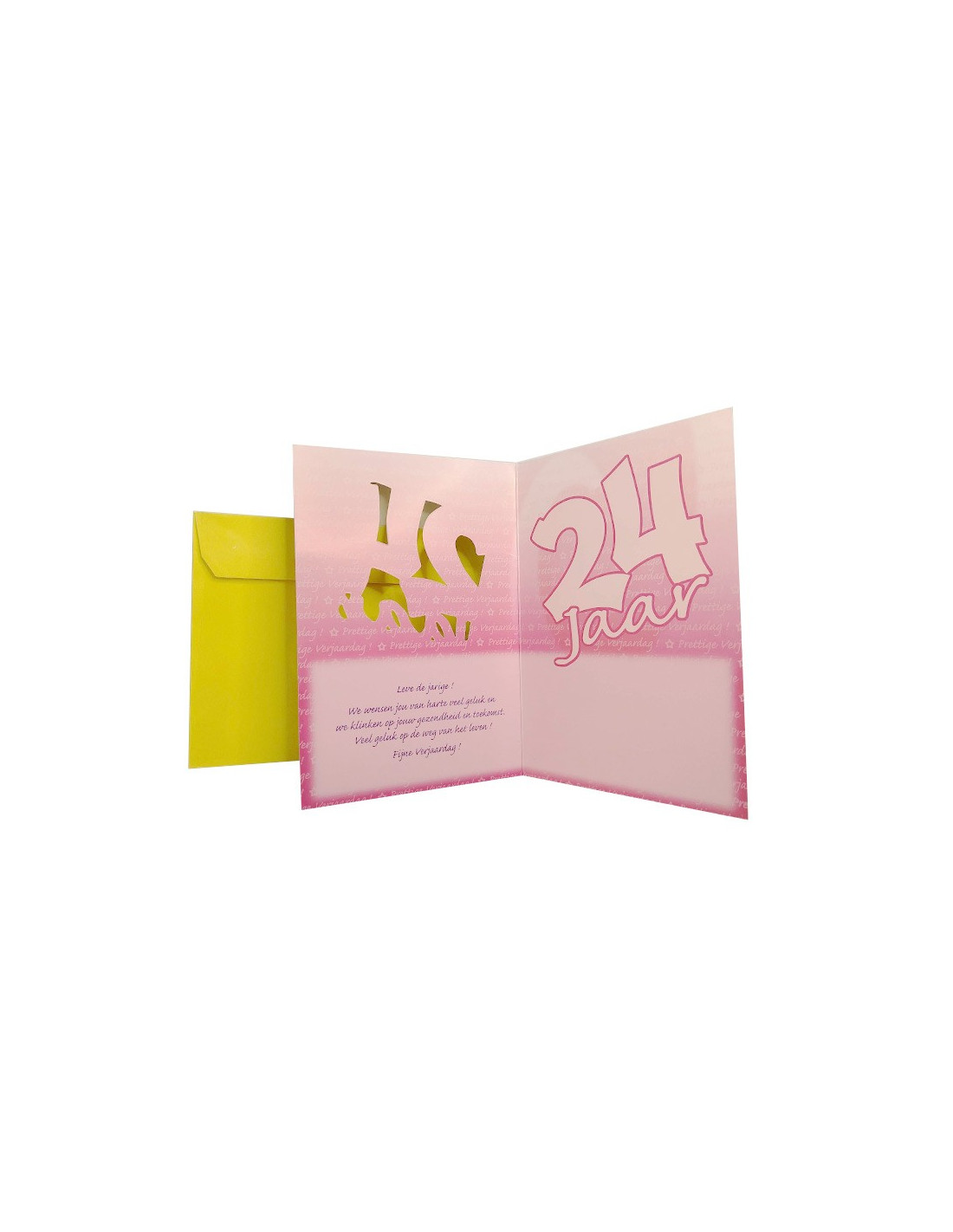 I ventiquattro anni sono una tappa incredibile nella vita! Festeggiatela con questo biglietto di auguri retrò e inviate i vostri migliori auguri alla persona cara. Festeggiate i suoi 24 anni con questo biglietto con effetto metallico dorato brillante. Il taglio del biglietto è originale e mette in risalto il numero di anni festeggiati. Accompagnata da un piccolo testo premuroso all'interno, c'è anche spazio per qualche parola più personale. Il biglietto è fornito con una busta abbinata. Il testo è solo in olandese.