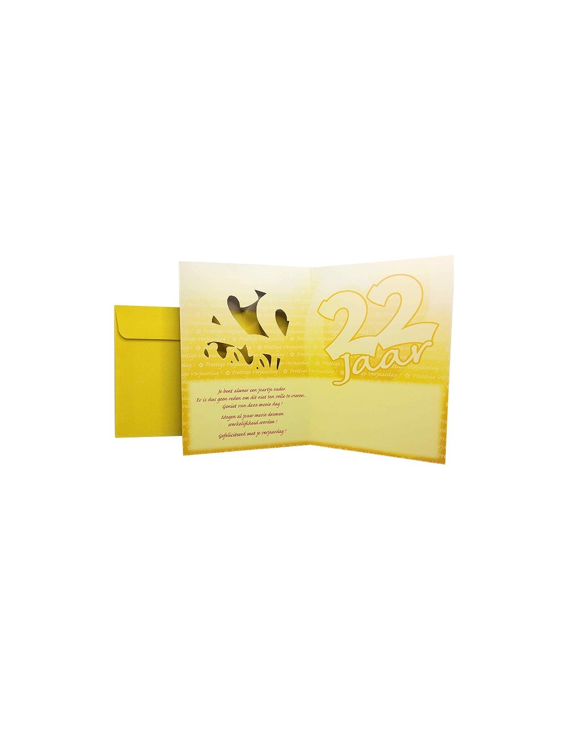 Festeggia il compleanno di una persona cara con questo biglietto di auguri in stile retrò. Per i suoi 22 anni, inviale tutti i tuoi auguri di felicità per questo nuovo anno. Il biglietto di auguri è decorato con dettagli metallici in rosa brillante. Il taglio del biglietto è originale e mette in risalto il numero di anni festeggiati. Accompagnato da un piccolo testo premuroso all'interno, c'è anche spazio per qualche parola più personale. Il biglietto è fornito con una busta abbinata. Il testo è solo in olandese.
