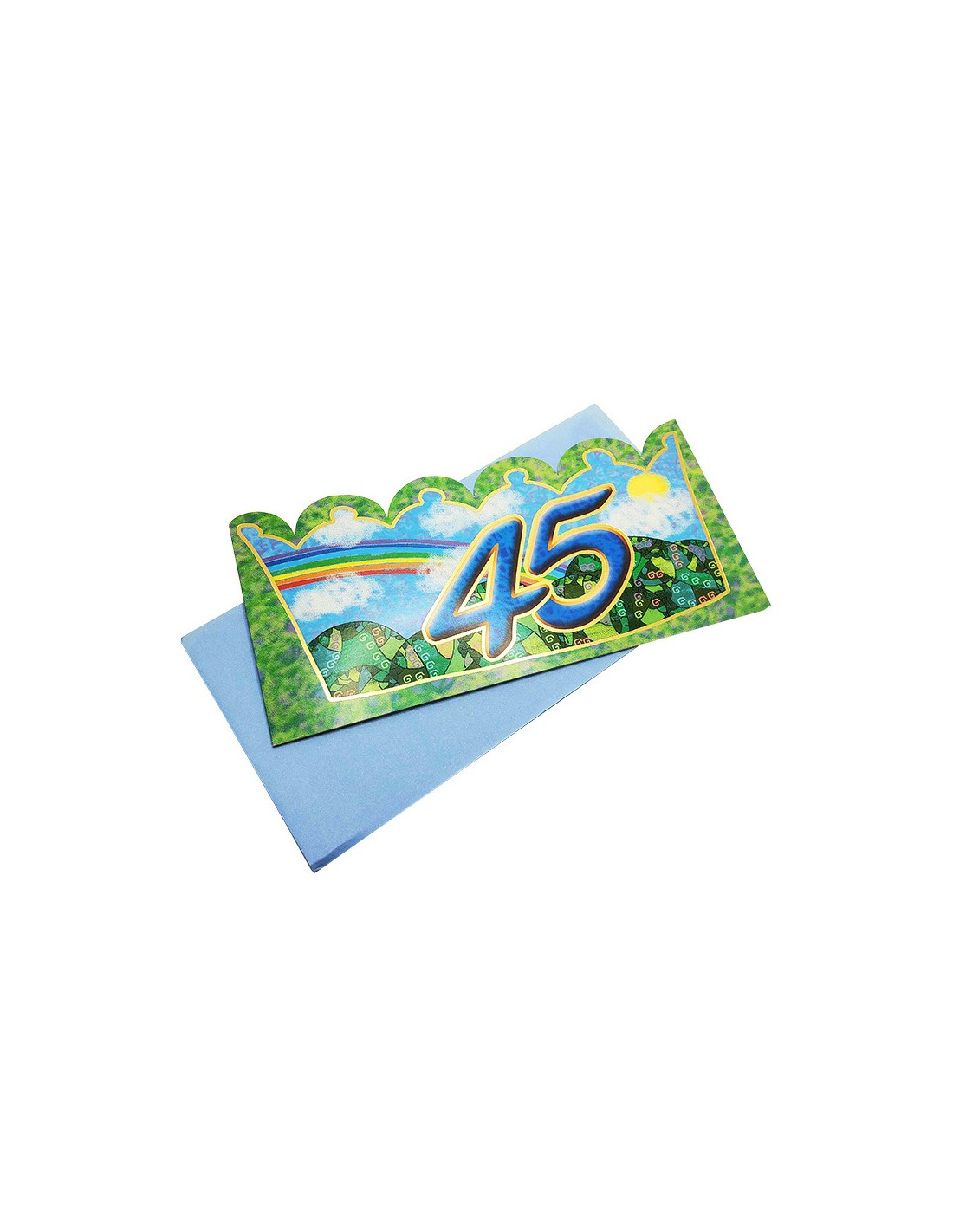 Festeggiate i 45 anni della persona cara con questo biglietto di auguri di compleanno. A forma di corona con contorni dorati, è decorata con motivi dai colori tenui e naturali. All'interno del biglietto è riportato un breve testo prestampato e c'è spazio per aggiungere qualche parola personale.