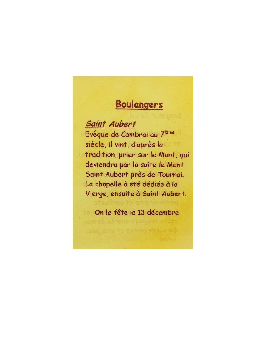 Questa cartolina è un piccolo strumento discreto per pregare i vostri santi patroni. È destinata ai panettieri e a tutti coloro che gravitano attorno a loro e spiega in poche parole il loro santo patrono: Sant'Aubert. Sul retro è scritta una breve preghiera dedicata a Gesù e alla grazia dei santi patroni per confortare negli sforzi, rafforzare la fede, superare gli ostacoli e proteggere dai mali quotidiani.
