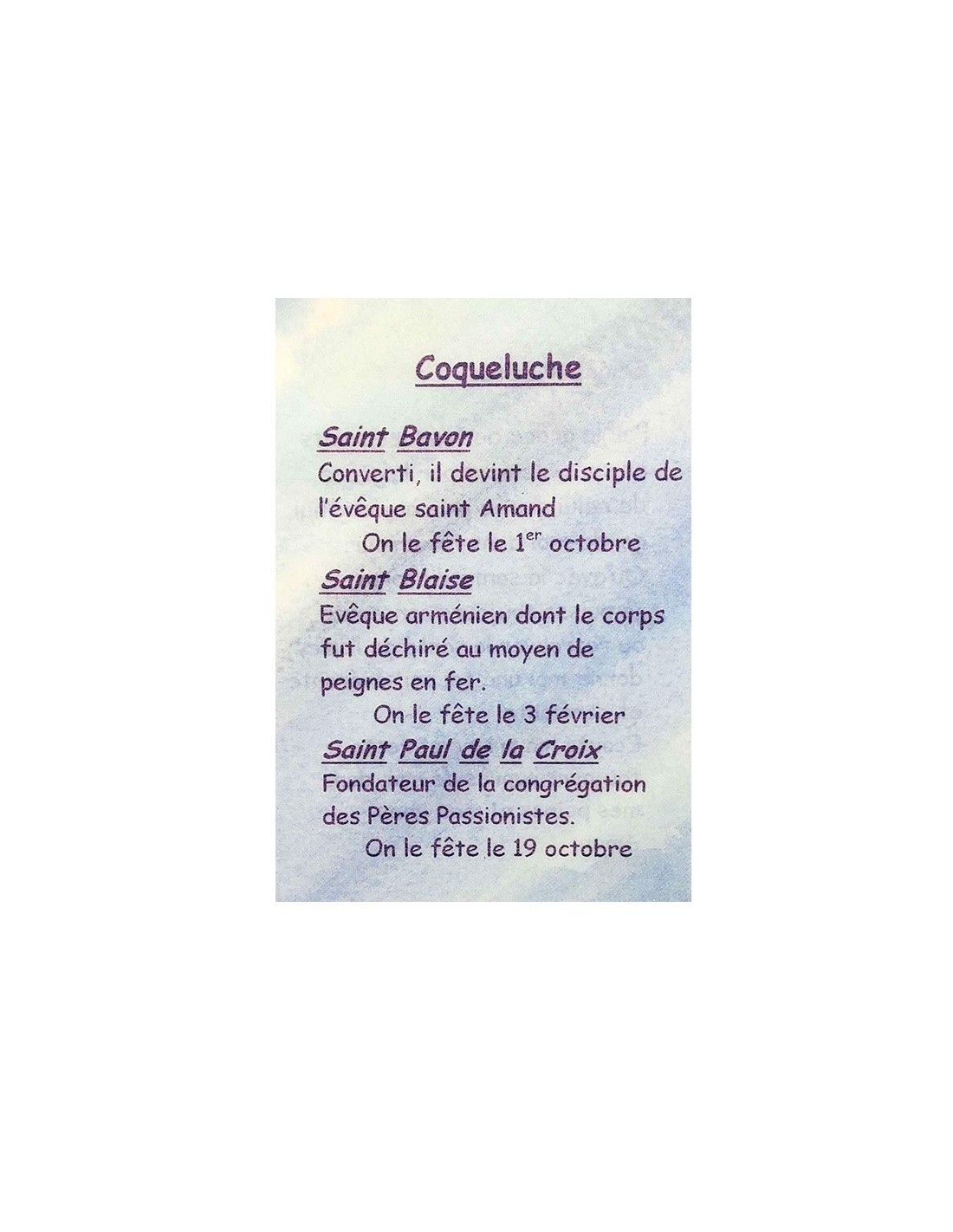 Questo biglietto è un piccolo strumento discreto per pregare i vostri santi patroni. È utile per la pertosse e spiega in poche parole quali santi patroni aiutano ad alleviarla o a guarirla: San Bavone, San Biagio e San Paolo della Croce. Sul retro è scritta una breve preghiera dedicata a Gesù e alla grazia dei santi patroni per confortare nello sforzo, rafforzare nella fede, superare gli ostacoli e proteggere dai mali quotidiani.