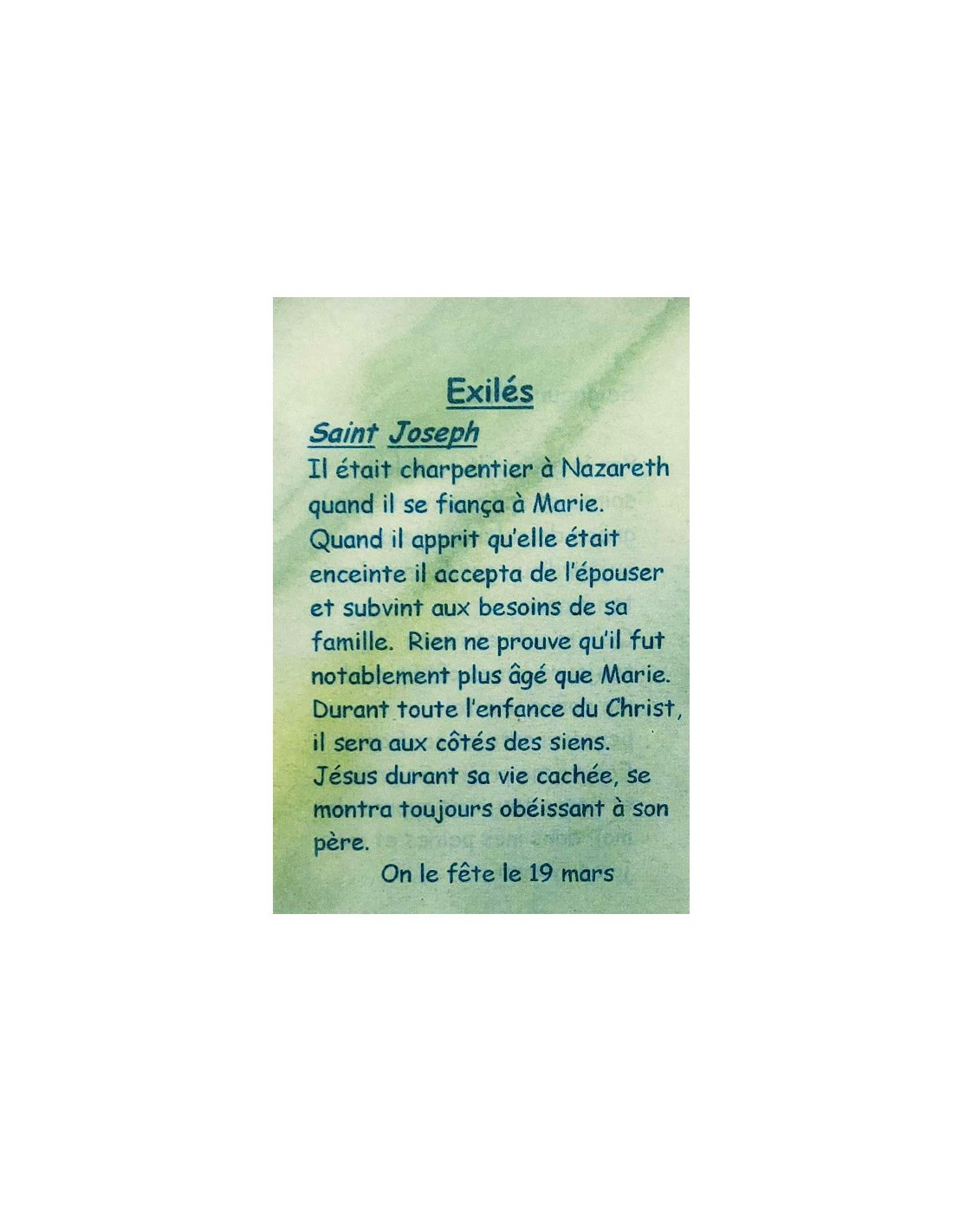 Questa cartolina è un piccolo strumento discreto per pregare i vostri santi patroni. È rivolta a tutti perché è una preghiera per gli esiliati. La cartolina spiega in poche parole il santo patrono: San Giuseppe. Sul retro è scritta una breve preghiera dedicata a Gesù e alla grazia dei santi patroni per confortare nello sforzo, rafforzare nella fede, superare gli ostacoli e proteggere dai mali quotidiani.