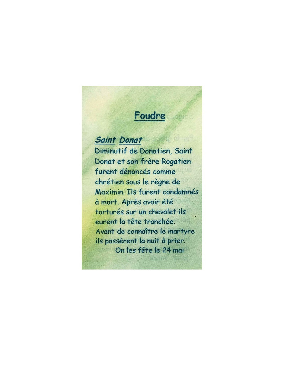 Questa cartolina è un piccolo strumento discreto per pregare i vostri santi patroni. È adatta a tutti perché è una preghiera contro i fulmini. La cartolina spiega in poche parole chi è il santo patrono: San Donato. Sul retro è scritta una breve preghiera dedicata a Gesù e alla grazia dei santi patroni per confortare negli sforzi, rafforzare la fede, superare gli ostacoli e proteggere dai mali quotidiani.
